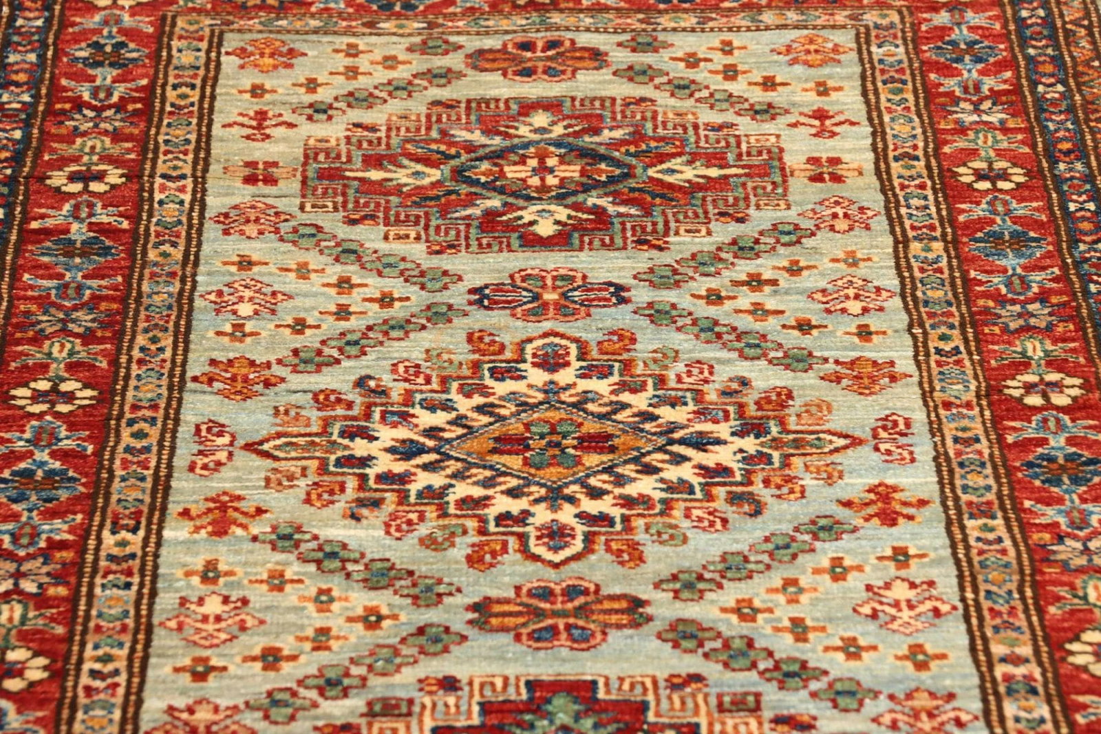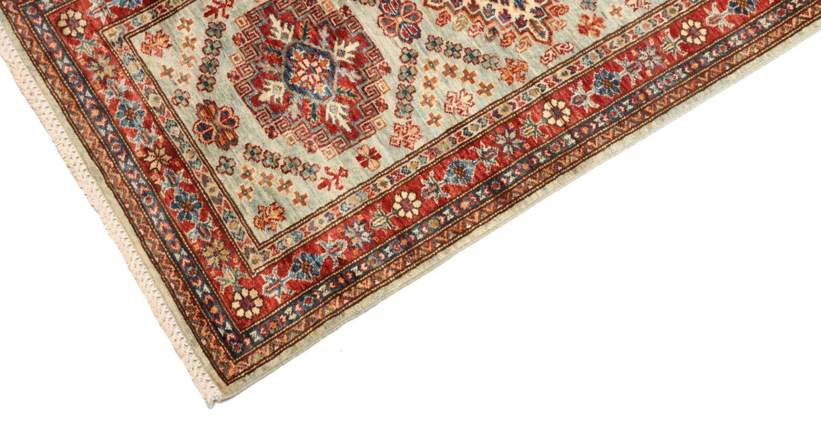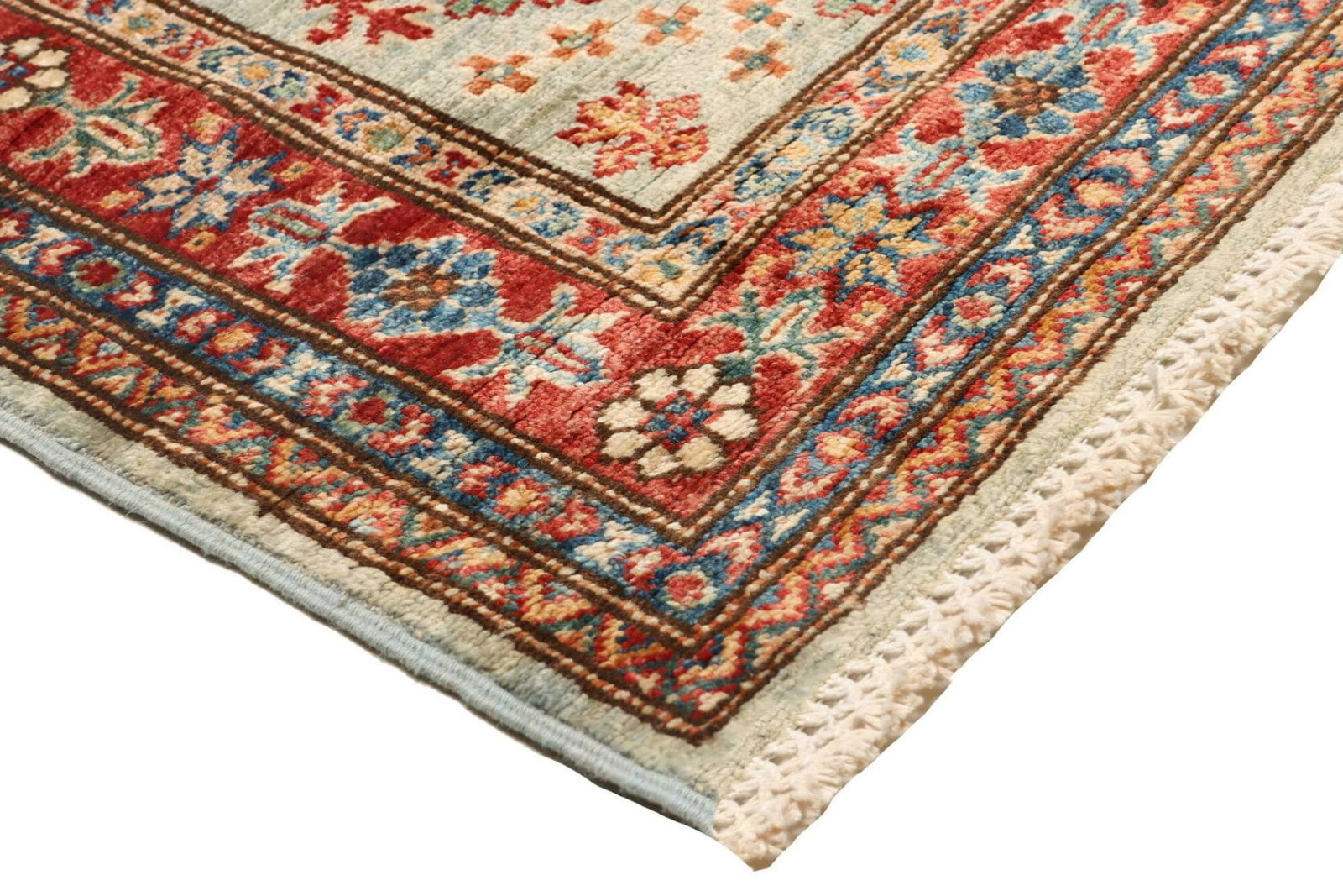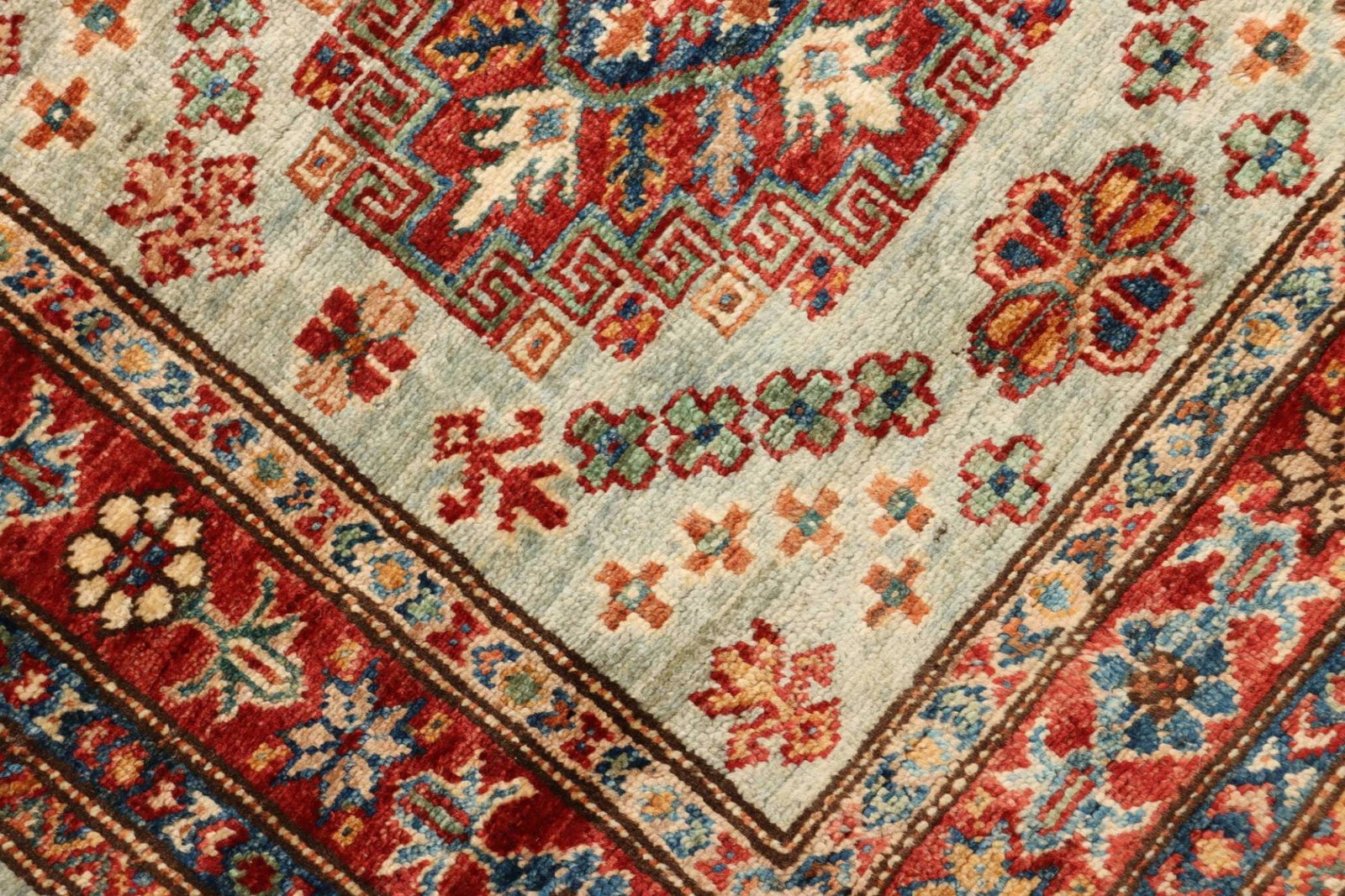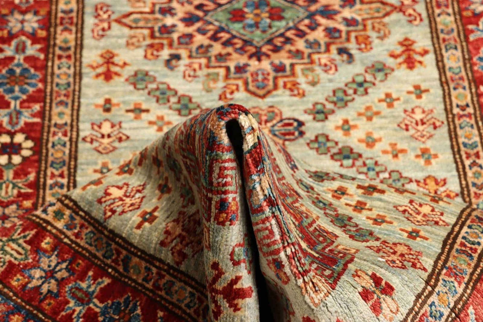 Mit einer hohen Knotendichte, die für die handgeknüpften Teppiche typisch ist, garantiert der Kazak Teppich eine ausgezeichnete Qualität und anhaltende Strapazierfähigkeit. Die präzise Verarbeitung sorgt dafür, dass das geometrische Muster klar und detailreich hervorsticht. Jedes Knotengewürge ist das Ergebnis stundenlanger, sorgfältiger Handarbeit, die in der Teppichproduktion eine zentrale Rolle spielt.