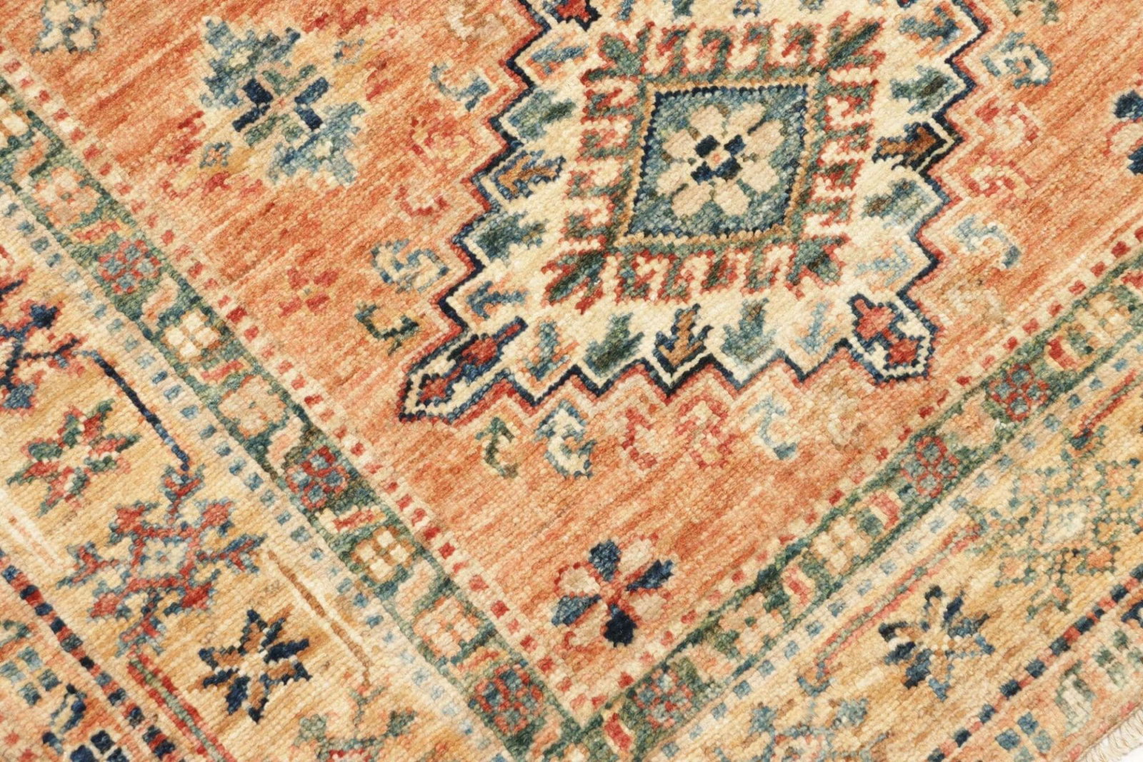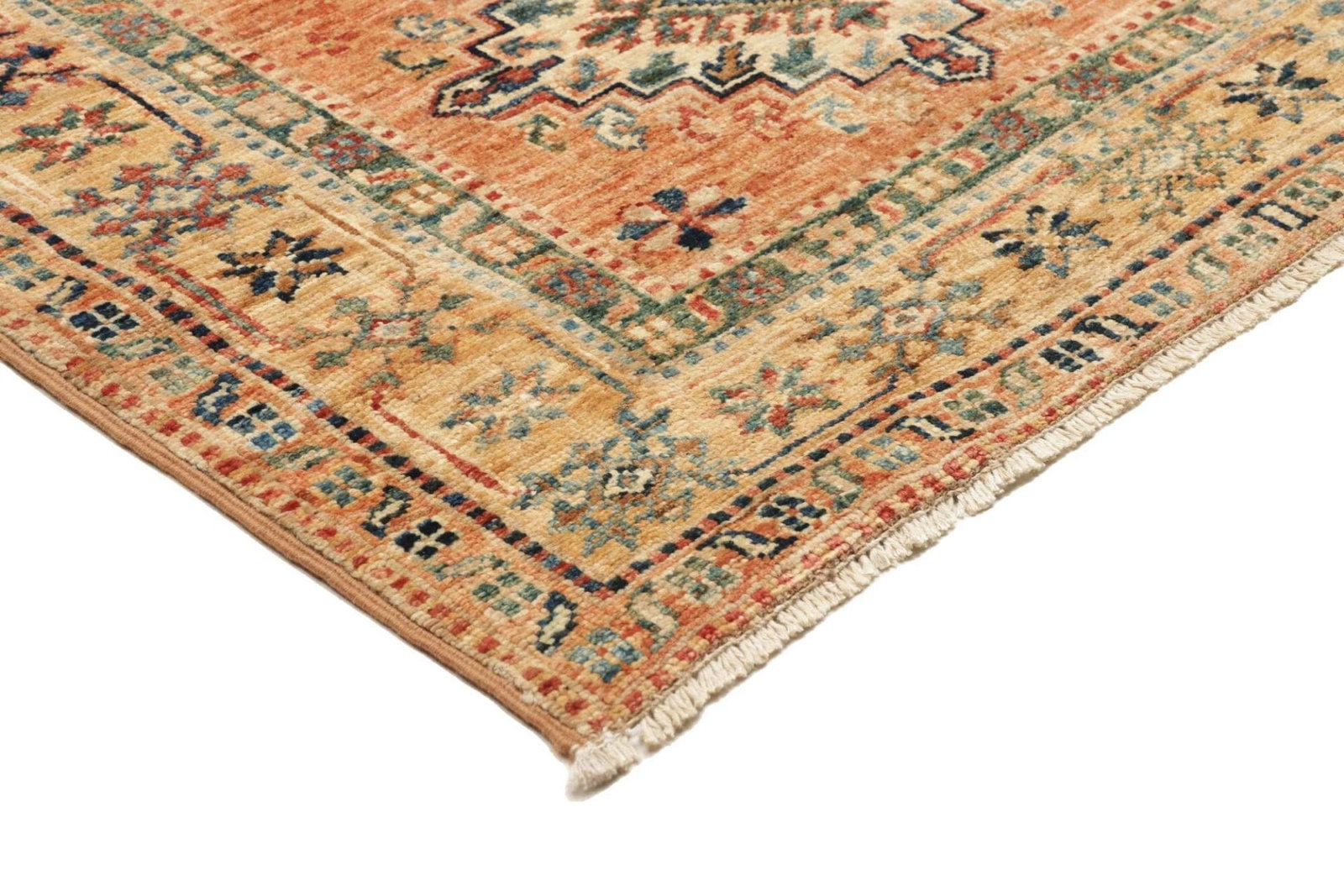 Der Kazak Teppich ist aus hochwertiger Schurwolle gefertigt, die für ihre Strapazierfähigkeit und Weichheit bekannt ist. Schurwolle hat die hervorragende Eigenschaft, Wärme zu speichern und dabei gleichzeitig atmungsaktiv zu sein, was diesen Teppich zu einer idealen Wahl für jede Jahreszeit macht. Die handgeknüpfte Technik garantiert nicht nur die Langlebigkeit des Teppichs, sondern sorgt auch für eine besondere Detailgenauigkeit in der Musterung. Jeder Teppich ist ein Unikat und spiegelt das handwerkliche Können der Teppichknüpfer wider.