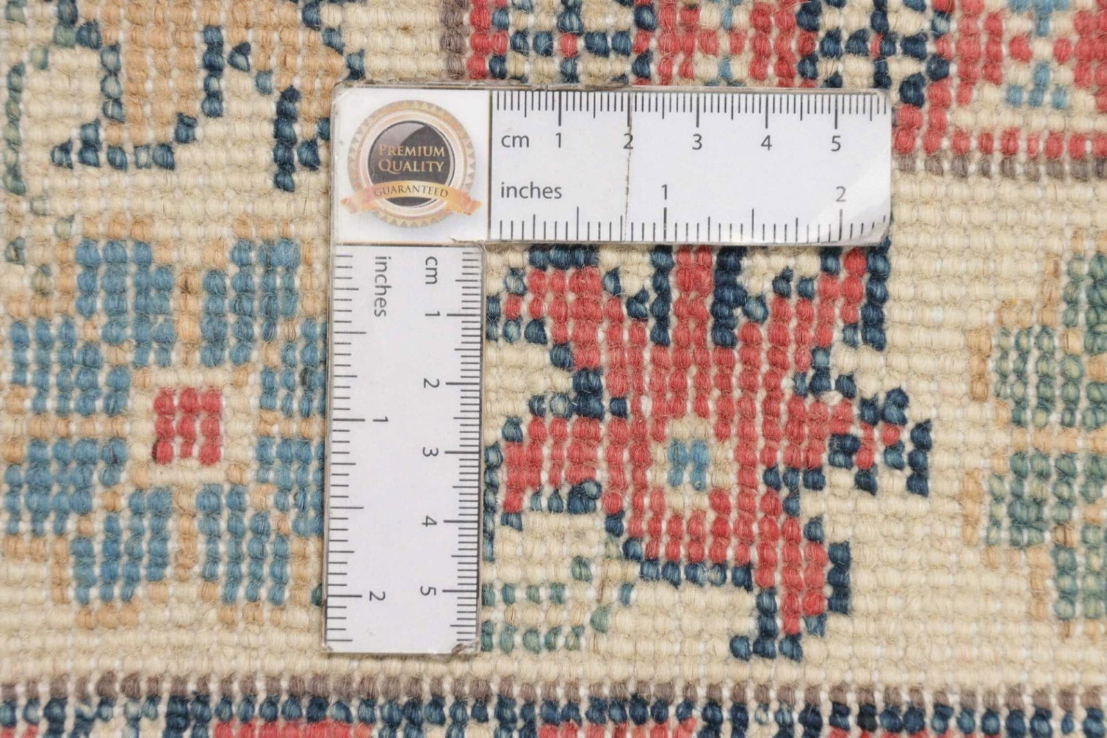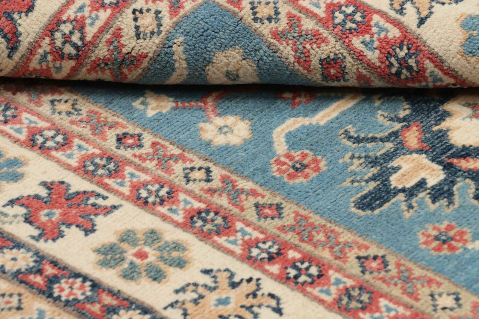 Echte Kazak Teppiche sind handgeknüpft und weisen eine hohe Knotendichte auf. Zudem sind sie aus natürlichen Materialien gefertigt. Überprüfen Sie auch die Rückseite des Teppichs – bei handgeknüpften Teppichen sind die Knoten klar zu erkennen.