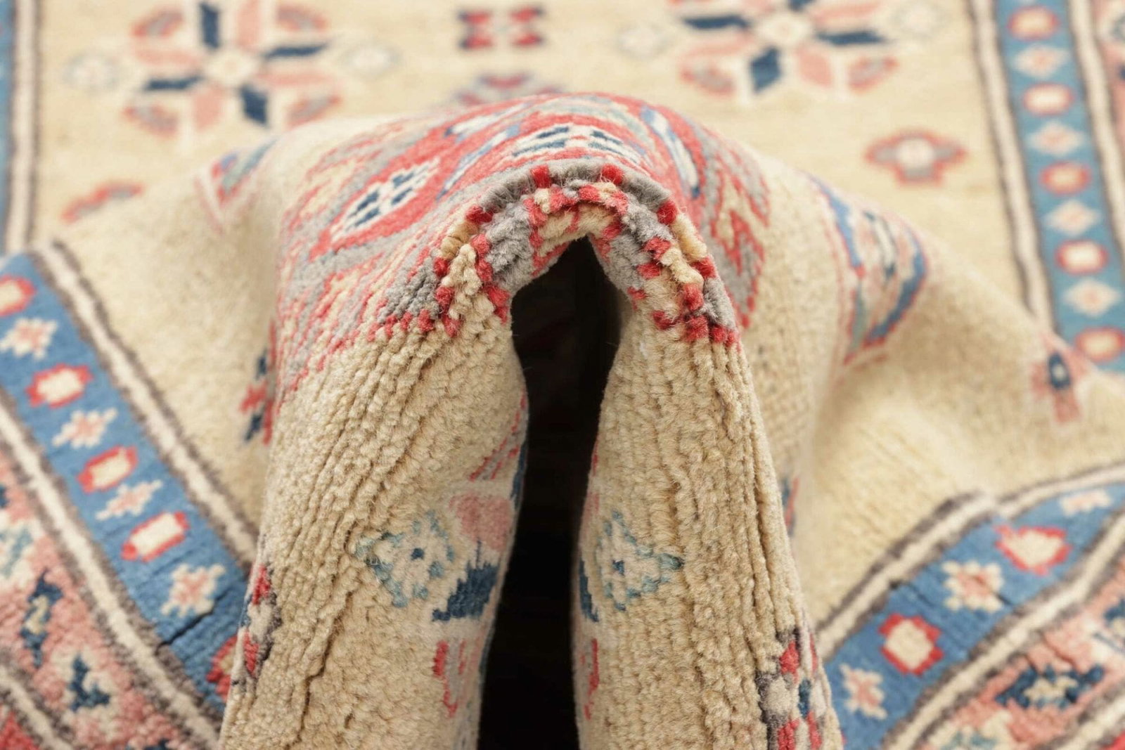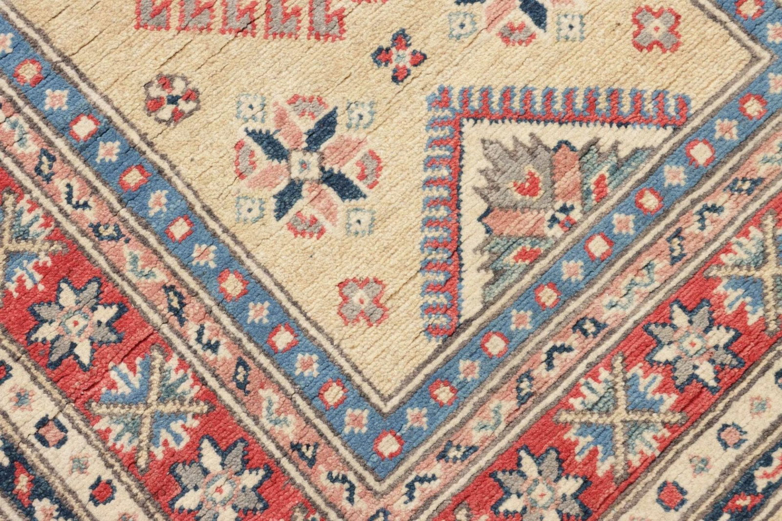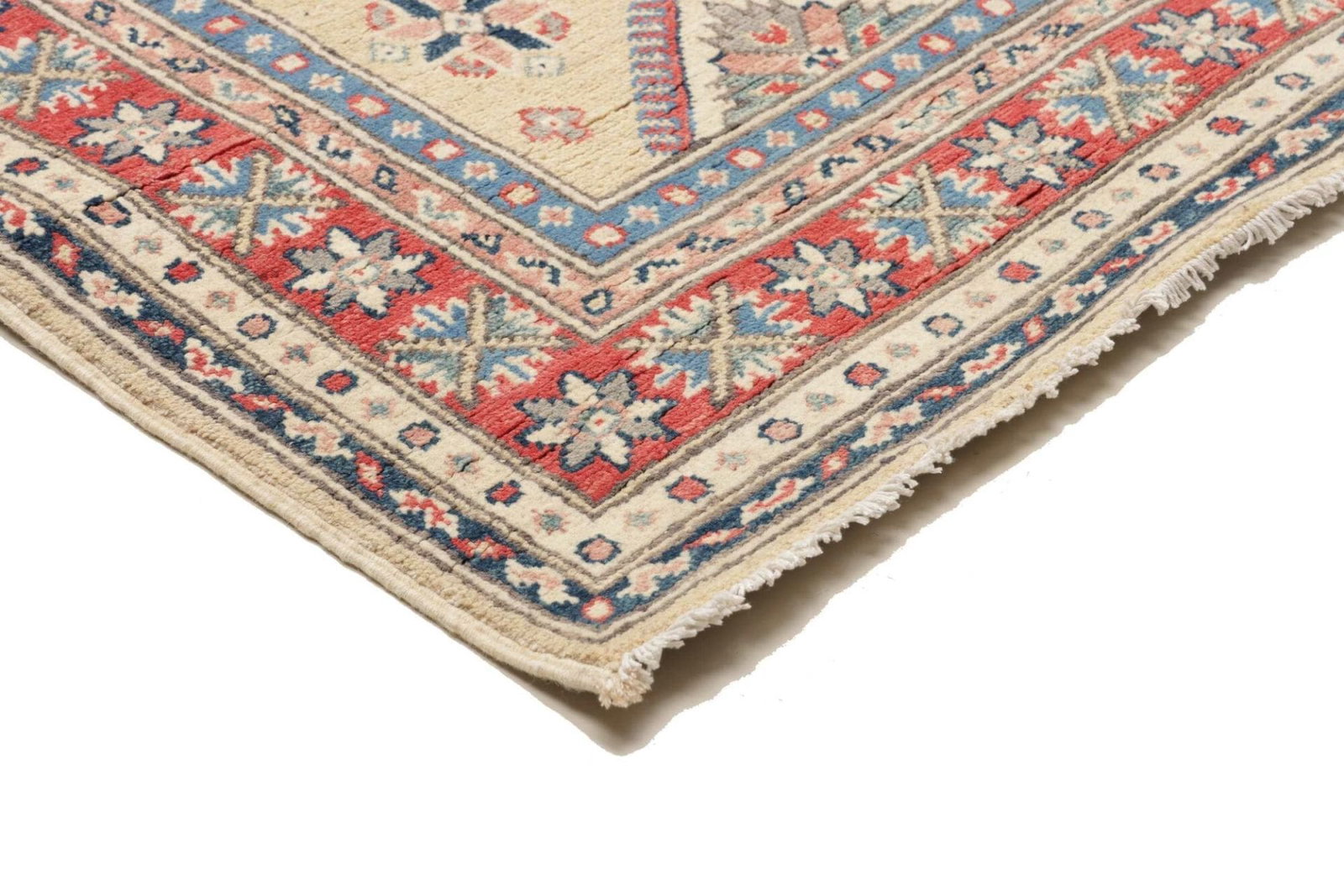Der Kazak Teppich wird aus sorgfältig ausgewählten Materialien hergestellt, um Langlebigkeit und Komfort zu gewährleisten. Er zeichnet sich durch eine hohe Knotendichte aus, die für eine robuste Struktur sorgt und gleichzeitig eine weiche Fußoberfläche bietet. Diese handgeknüpfte Technik ermöglicht nicht nur eine detailreiche Ausarbeitung der Muster, sondern auch eine einzigartige Individualität eines jeden Teppichs. Dank der hochwertigen Rohstoffe bleibt der Teppich über Jahre hinweg in herausragendem Zustand und ist sowohl für den Wohnbereich als auch für öffentliche Räume geeignet.