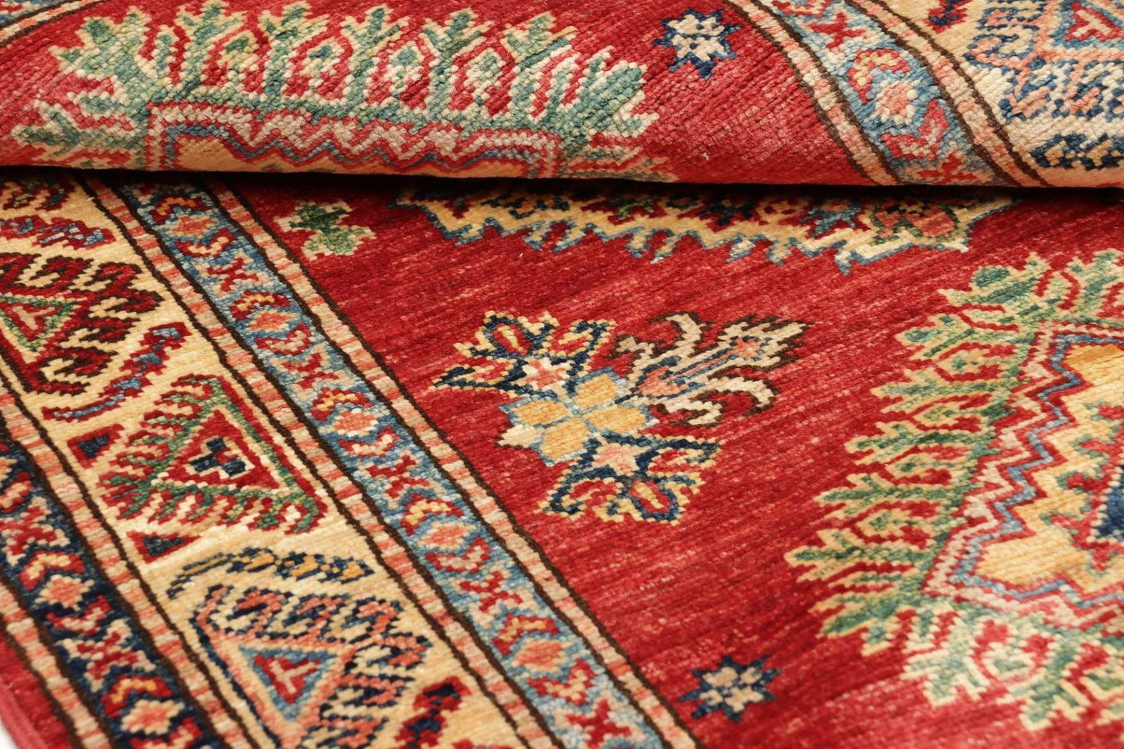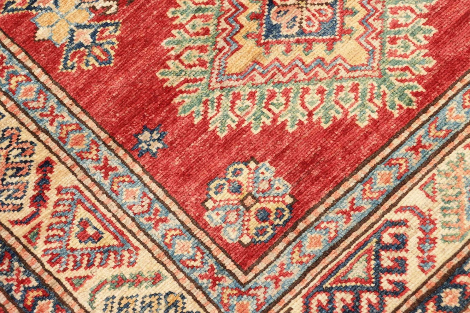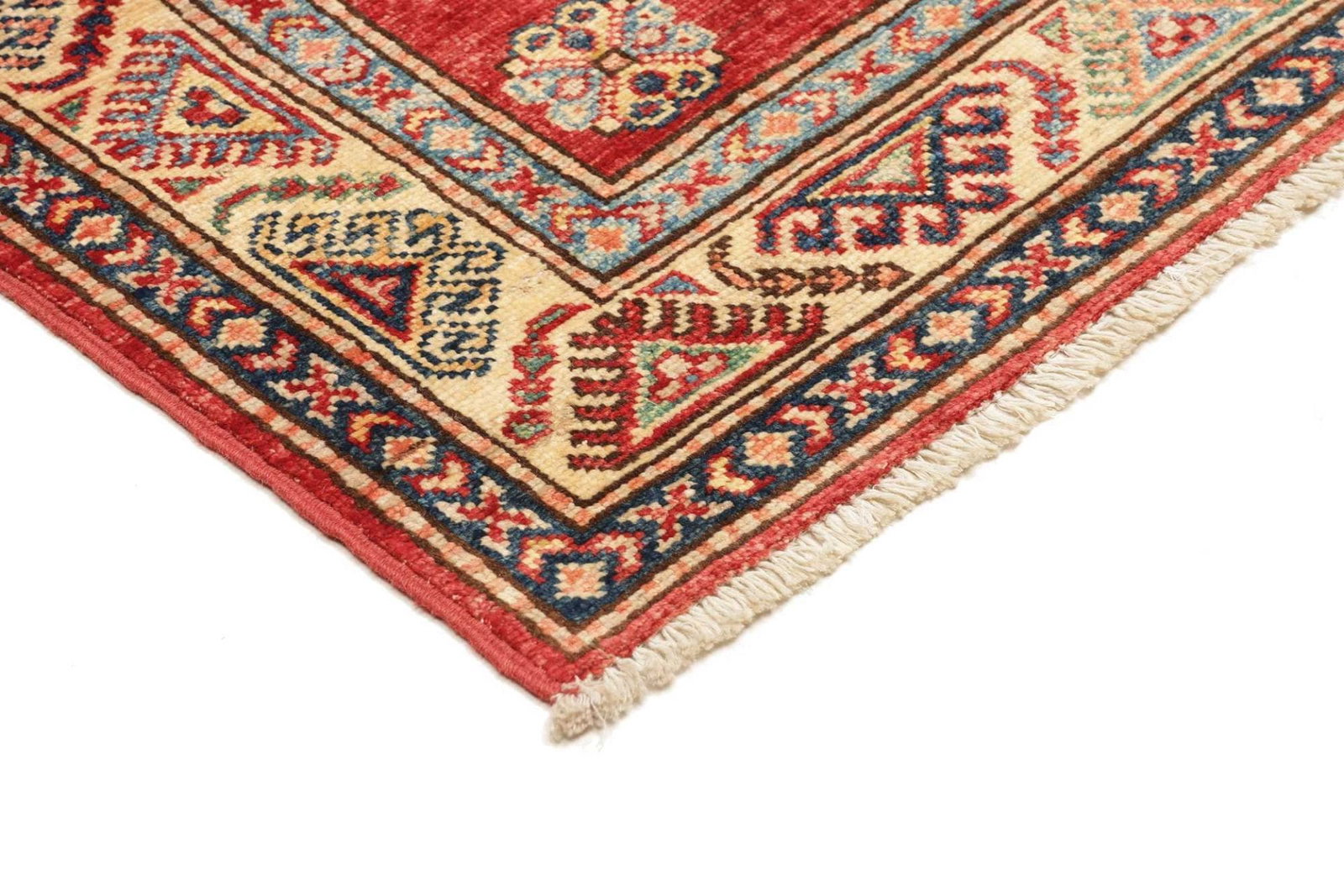 Der Kazak Teppich wurde mit höchster Präzision handgeknüpft, was eine unvergleichliche Qualität und Langlebigkeit garantiert. Die Verwendung von feinen Wollfasern sorgt für einen angenehm weichen Touch und eine natürliche Farbgebung, die durch traditionelle Färbetechniken erreicht wird. Die Knotendichte ist bemerkenswert hoch, was bedeutet, dass die Details der geometrischen Muster klar und präzise zur Geltung kommen. So erhalten Sie nicht nur einen Teppich, sondern ein Kunstwerk, das Generationen überdauern kann.