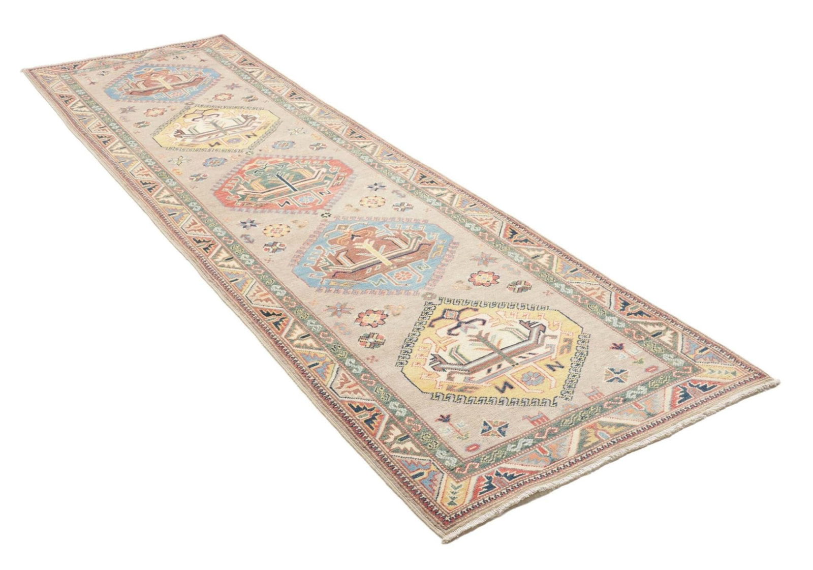 Kazak Teppich | Knotendichte: ca. 100.000 Knoten/m² | Material: 100% Schurwolle | Größe: 89 x 307 cm | Zustand: Ausgezeichnet | Herkunft: Handgeknüpft in Pakistan | Geometrisches Muster und Figuren