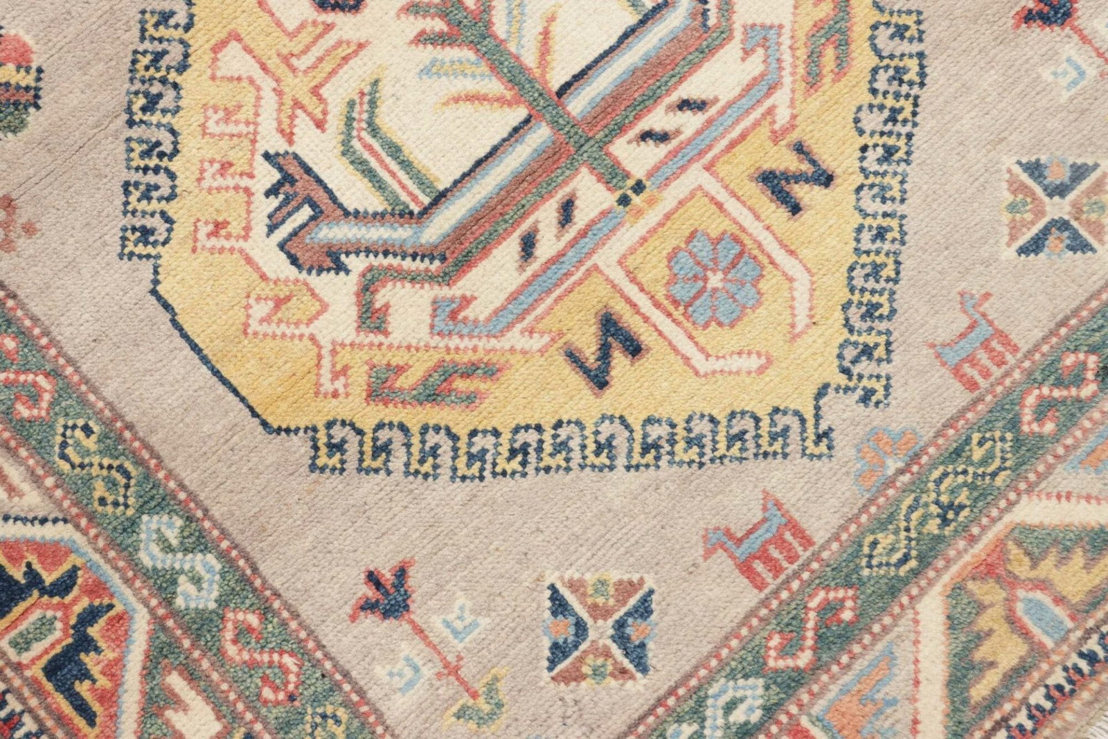 Der Kazak Teppich ist aus hochwertiger Schurwolle gefertigt, die für ihre Weichheit und Robustheit geschätzt wird. Die handgeknüpfte Technik sorgt dafür, dass jeder Teppich ein Unikat ist und höchste Qualität gewährleistet. Durch die liebevolle Handarbeit erhalten die Designs und Muster ihre charakteristische Tiefe und Lebendigkeit, die maschinell gefertigte Teppiche oft vermissen lassen. Die Knotendichte, die bei handgeknüpften Teppichen sehr hoch ist, trägt zusätzlich zur Langlebigkeit und Widerstandsfähigkeit des Teppichs bei.