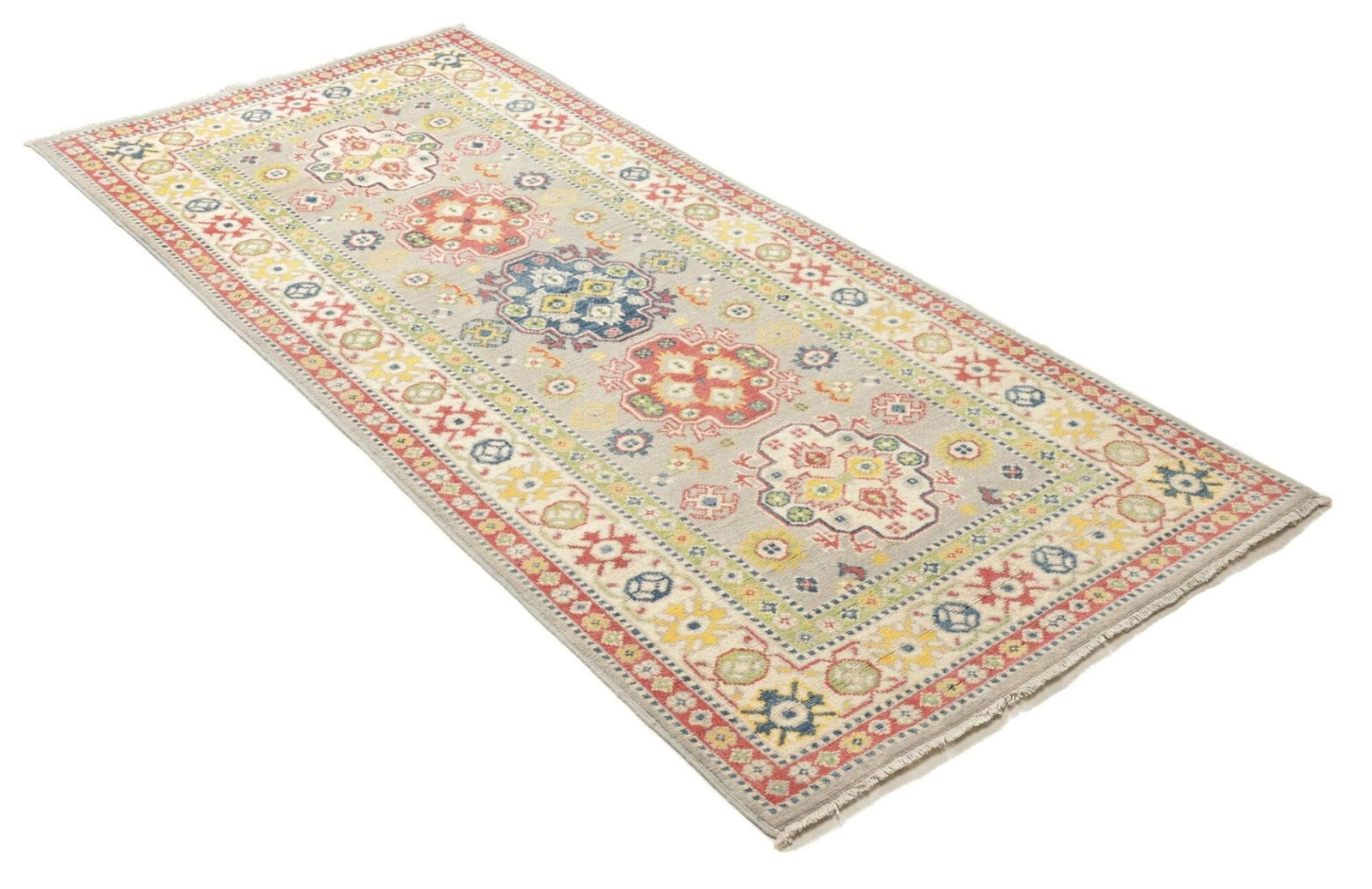 584$Ursprünglicher Preis war: 584$493$Aktueller Preis ist: 493$Kazak Teppich | Größe: 92 x 203 cm | Herkunft: Pakistan | Knotendichte: ca. 100.000 Knoten/m² | Flor: 100% Schurwolle | Kette: 100% Baumwolle | Höhe: ca. 7-10 mm | Handgeknüpfte Qualität | Geometrische Muster und Figuren