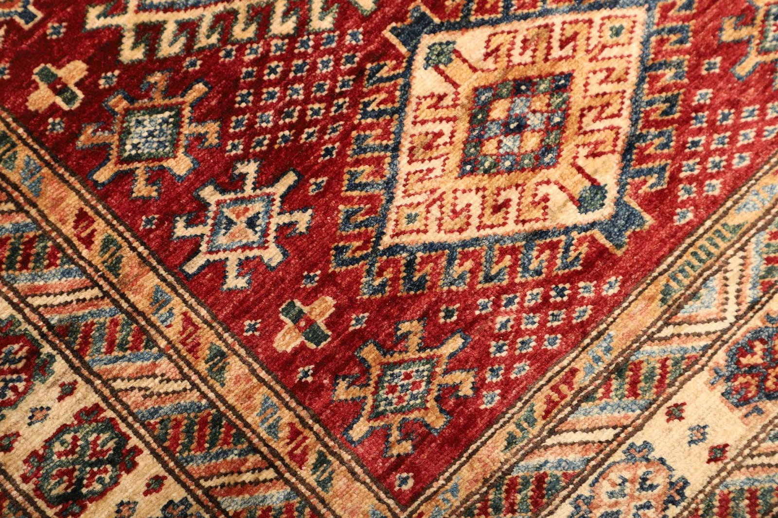 Der Kazak Teppich besteht aus hochwertigen Materialien, die für ihre Langlebigkeit und Widerstandsfähigkeit bekannt sind. Durch die handgeknüpfte Technik ist jeder Teppich ein Unikat, das mit viel Liebe und Hingabe gefertigt wurde. Diese traditionelle Methode sorgt nicht nur für eine beeindruckende Knotendichte, die sich in der Detailvielfalt und der damit verbundenen Qualität des Teppichs widerspiegelt, sondern verleiht dem Teppich auch einen außergewöhnlichen Komfort. Handgeknüpfte Teppiche sind in der Regel robuster und halten über viele Jahre, wenn sie gut gepflegt werden.