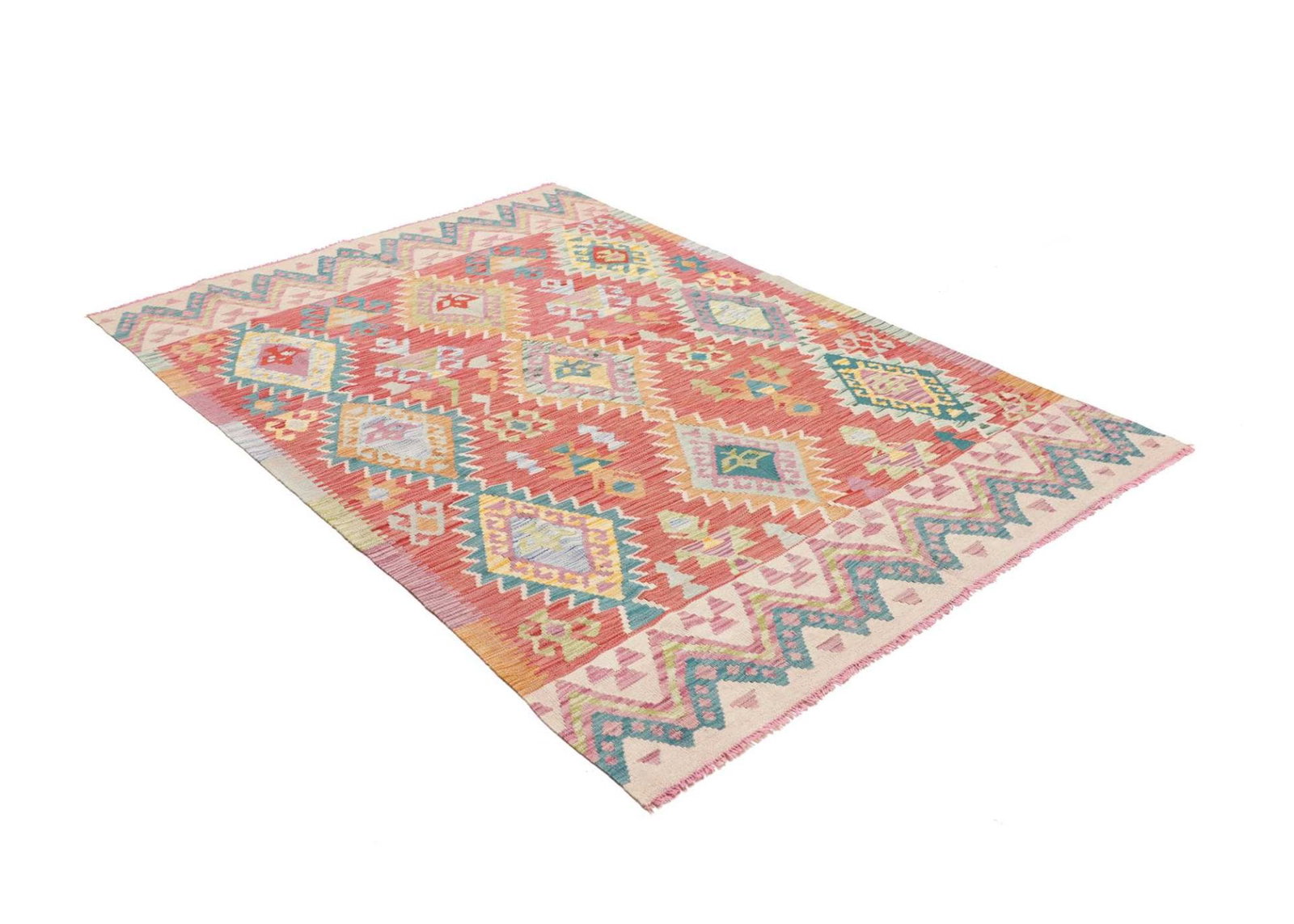 Der Kelim Teppich ist handgewebt und zeichnet sich durch einen Flor aus 100% Schurwolle sowie einer Kette aus 100% Baumwolle aus. Im Gegensatz zu klassischen Orientteppichen werden Kelim Teppiche gewebt und nicht geknüpft. Diese Technik ermöglicht einen dünnen Flor von etwa 5 mm Höhe, der eine angenehme Haptik bietet und ideal für moderne Wohnräume ist. Kelims sind zudem bekannt für ihre hohe Strapazierfähigkeit und Langlebigkeit, was sie zu einer praktischen Wahl für den Alltag macht.