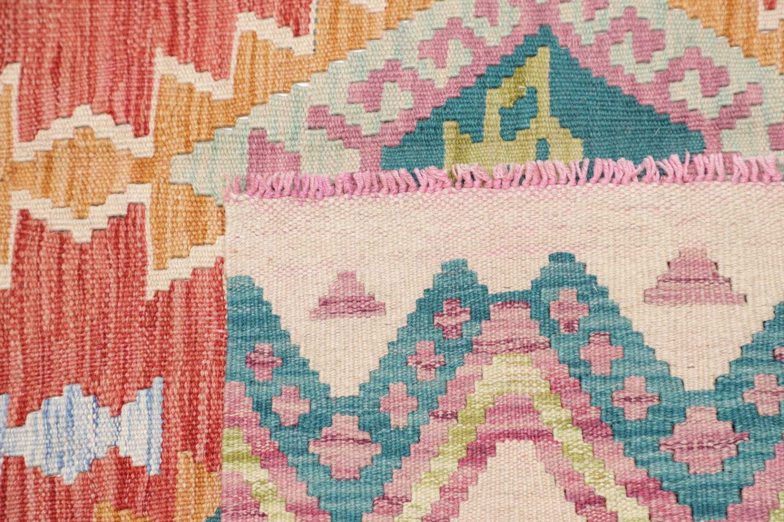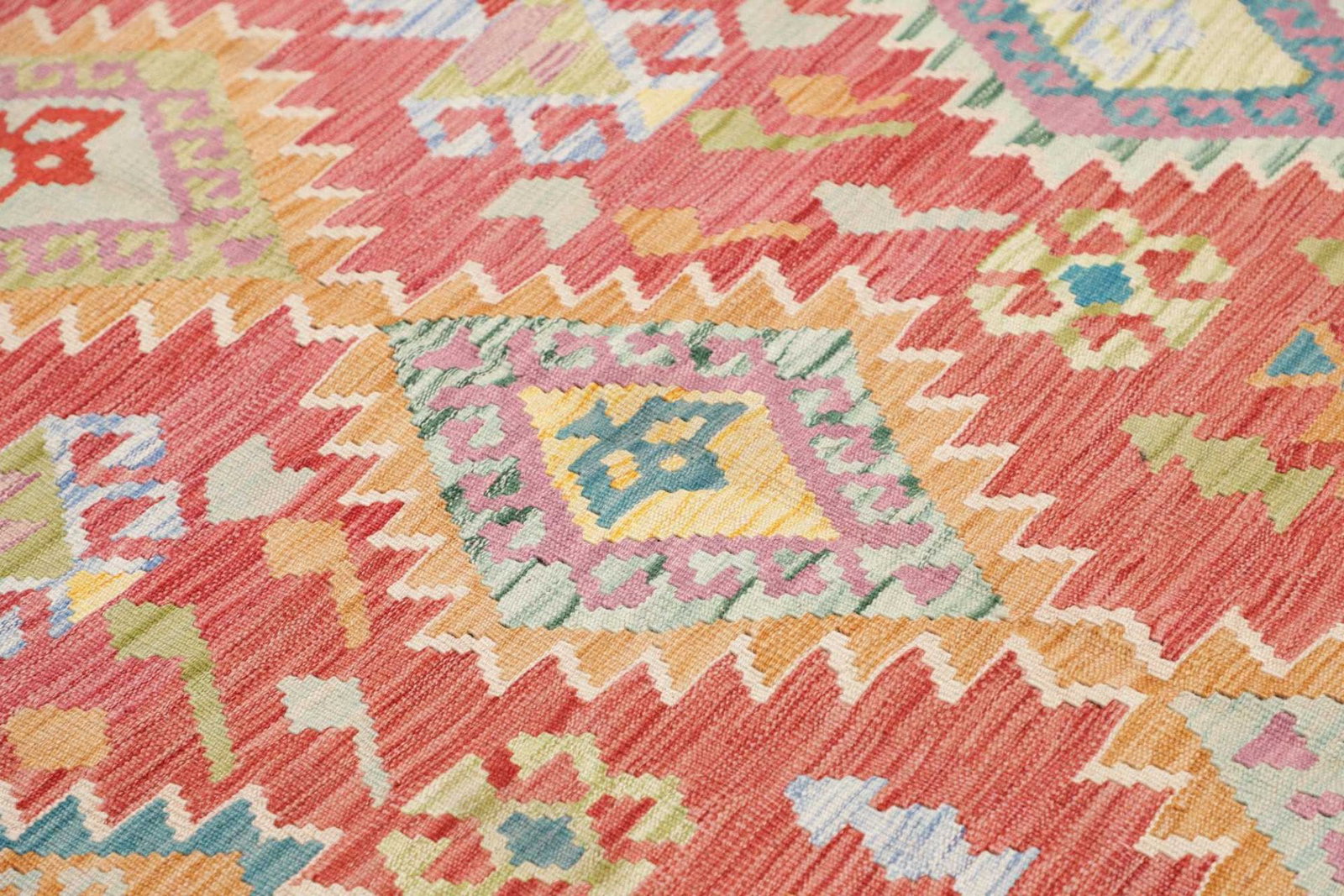 Die handgewebte Qualität dieses Kelims ist ein Zeichen für die hohe Kunstfertigkeit der Teppichweber. Diese Kelims sind nicht nur dekorativ, sondern auch funktional, da sie durch ihre schalldämpfenden Eigenschaften und die Regulierung der Luftfeuchtigkeit das Raumklima verbessern. Die Verwendung von Schurwolle sorgt für eine weiche und angenehme Oberfläche, die sich sowohl für den Wohnbereich als auch für Schlafzimmer eignet. Die Kombination aus traditioneller Technik und modernen Designansprüchen macht diesen Kelim zu einem besonderen Stück für jeden Haushalt.