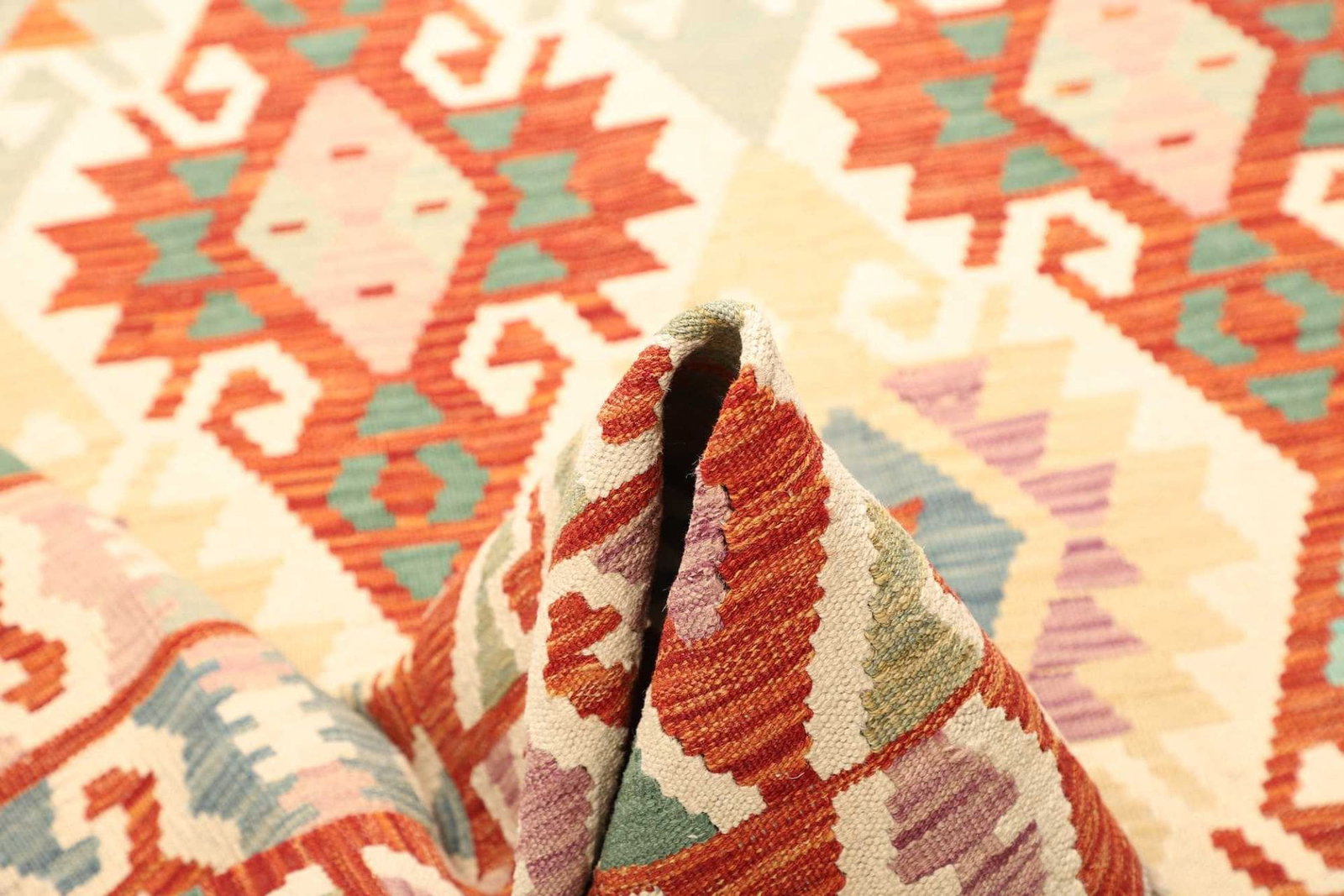 Der afghanische Kelim ist aus hochwertiger Wolle gefertigt, die nicht nur für ihre Robustheit, sondern auch für ihre Weichheit geschätzt wird. Wolle ist ein natürliches Material, das für seine Wärme und Langlebigkeit bekannt ist und in der Teppichindustrie oft verwendet wird. Durch das handgewebte Verfahren erhält der Kelim eine unnachahmliche Textur, die ihn nicht nur zu einem optischen Highlight, sondern auch zu einem taktilen Erlebnis macht.