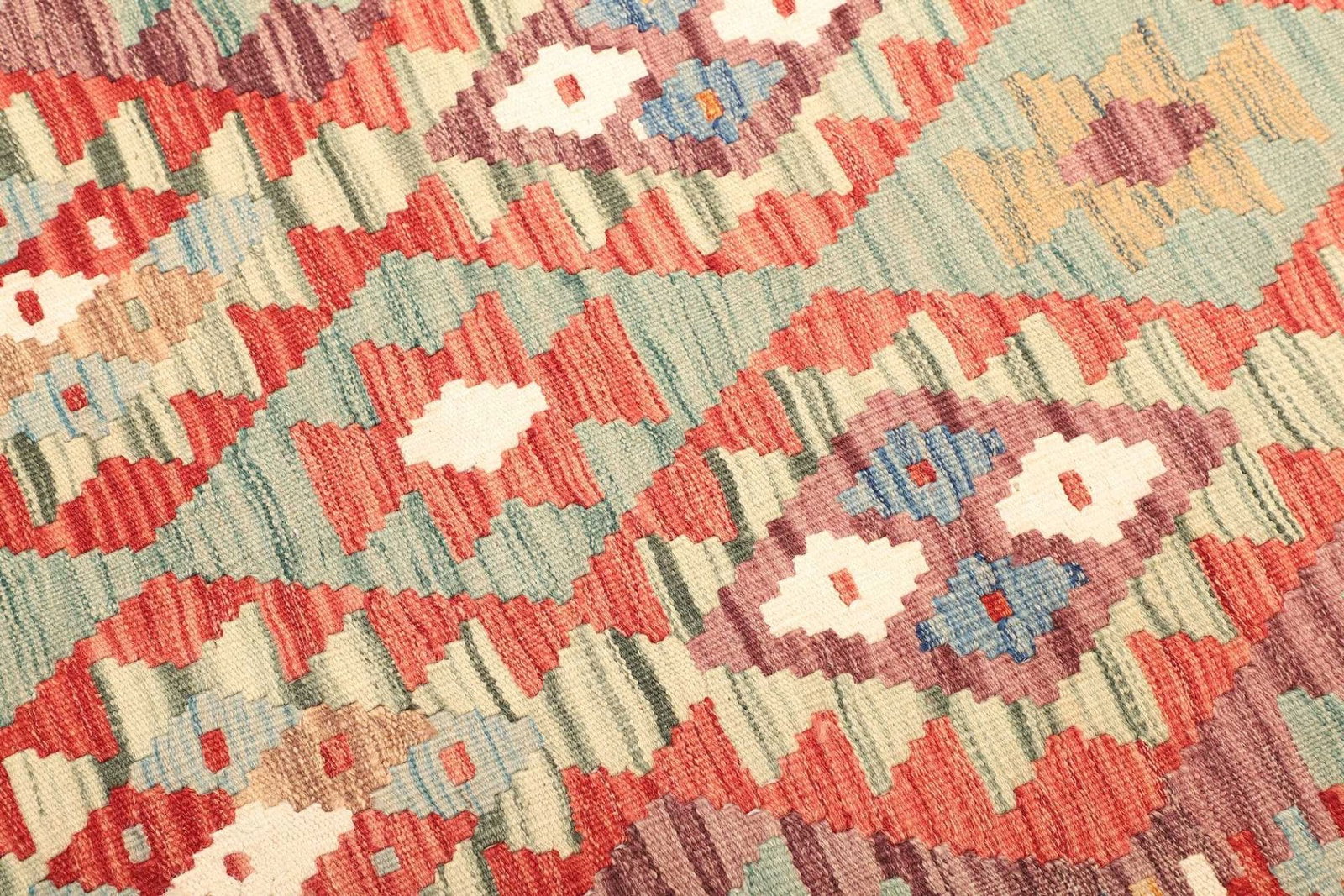 Die Kombination aus rustikalem Flair und den klaren, linearen Designs macht diesen Kelim zu einer idealen Wahl für moderne und traditionelle Einrichtungsstile.