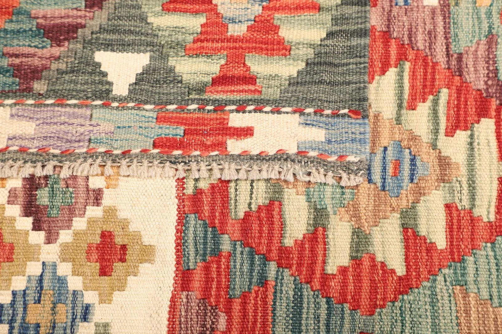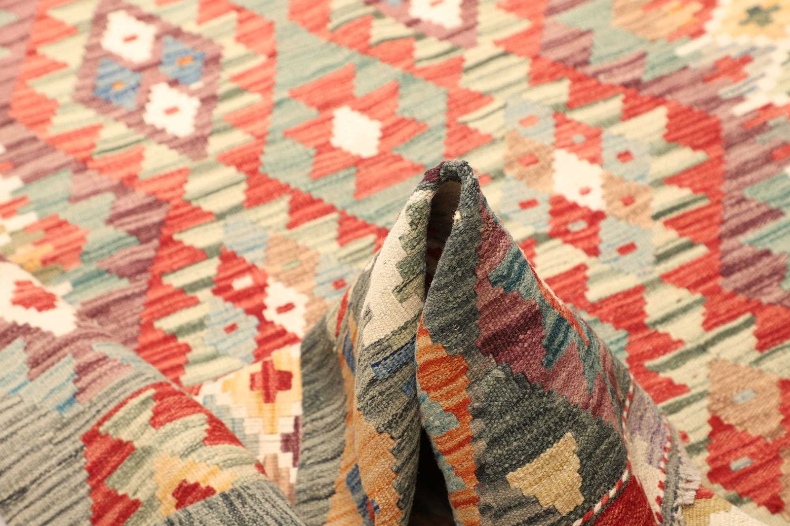 Die Knotendichte und die Verarbeitung dieses Kelims sind von hoher Qualität, was ihm eine bemerkenswerte Strapazierfähigkeit verleiht. Handgewebte Teppiche haben in der Regel eine niedrigere Knotendichte als handgeknüpfte Teppiche – dies ist jedoch kein Qualitätsmangel, sondern ein typisches Merkmal der Kelim-Technik, die sich durch ein flacheres Muster und klare Linien auszeichnet.