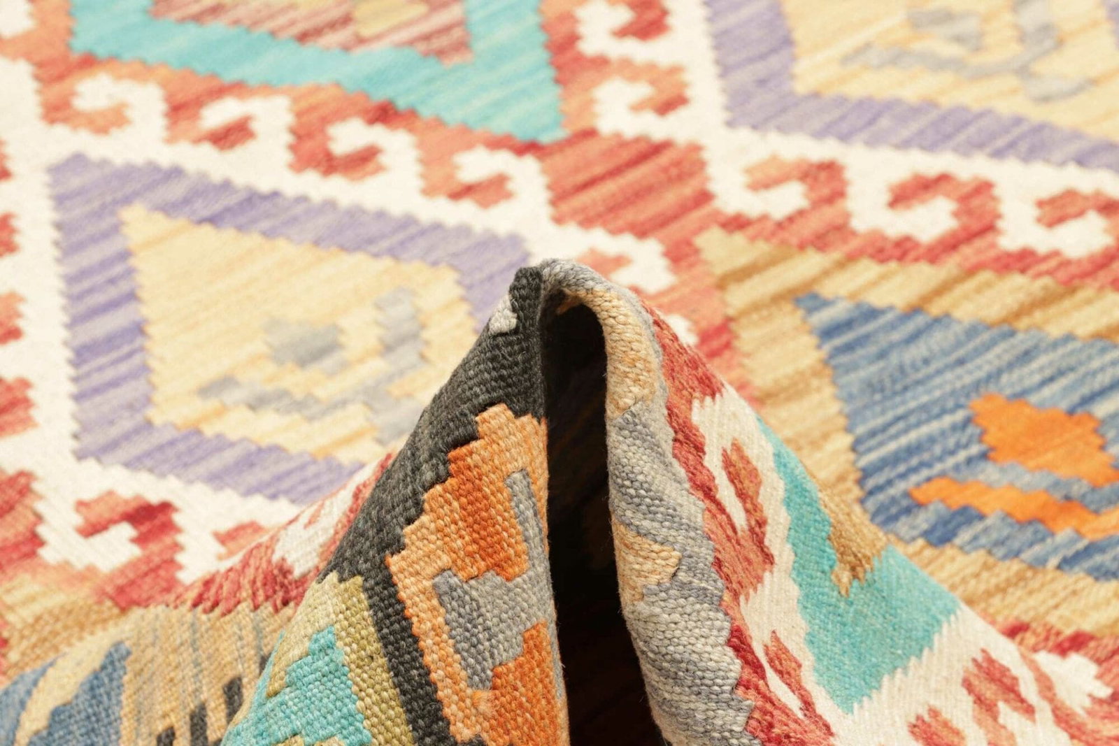 Die Grundlage dieses Teppichs ist Schurwolle, ein Material, das für seine Weichheit und Langlebigkeit bekannt ist. Schurwolle ist nicht nur umweltfreundlich, sondern sorgt auch für eine hervorragende Wärmeisolation und Komfort. Durch die handgewebte Technik wird jeder Teppich zu einem Unikat, das durch seine individuellen Merkmale besticht. Die Knotendichte ist bei handgewebten Kelims im Vergleich zu handgeknüpften Teppichen typischerweise geringer, was zu einem flacheren, aber dennoch sehr ansprechenden Textil führt. Diese Art der Verarbeitung erlaubt es, komplexe Muster zu kreieren und bietet gleichzeitig eine angenehme Oberfläche.