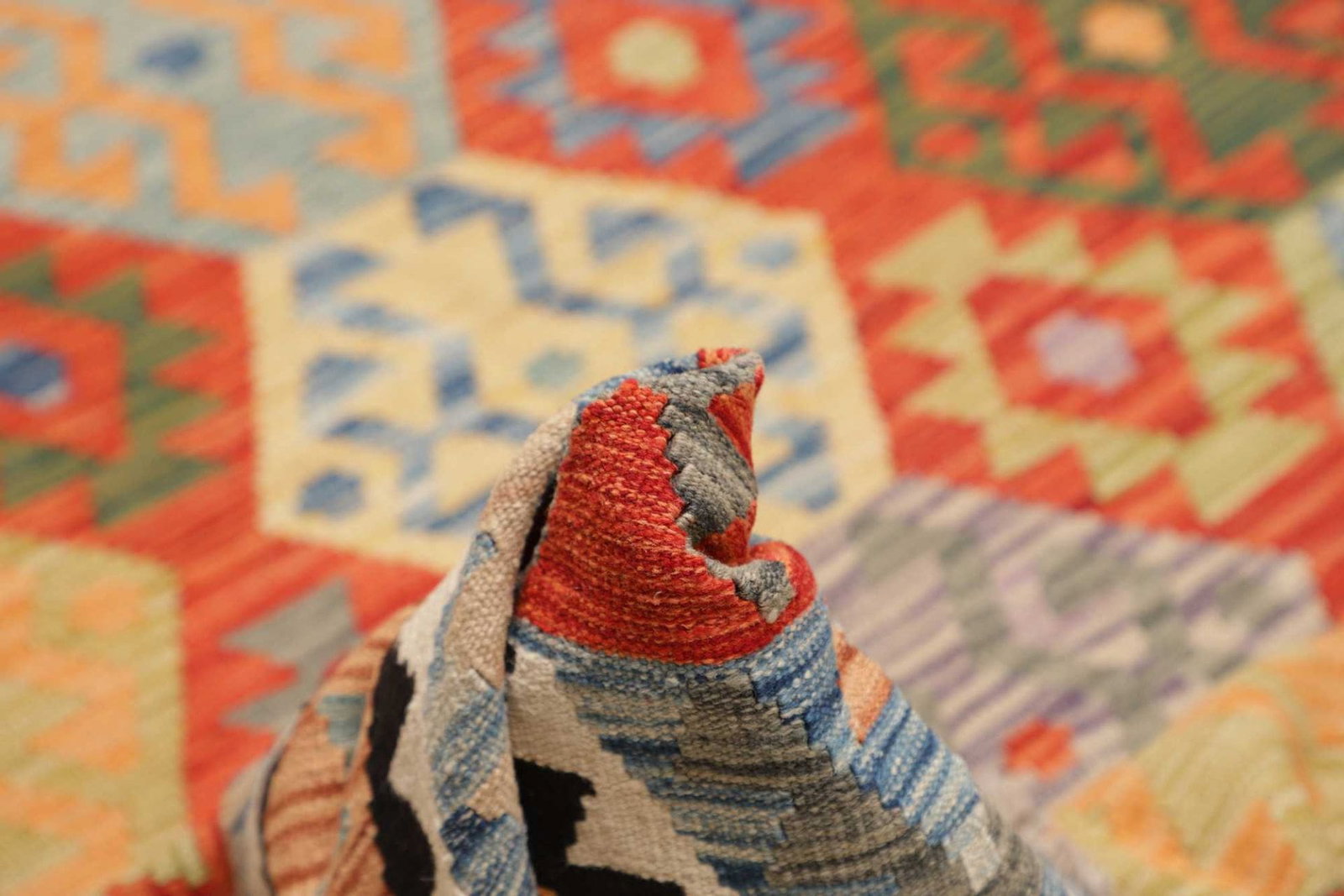 Kelim Teppiche werden durch eine spezielle Webtechnik hergestellt, bei der die Wolle in einem flachen Muster gewebt wird, im Gegensatz zu geknüpften Teppichen. Diese Technik ermöglicht eine beidseitige Nutzung und ein geringes Gewicht.
