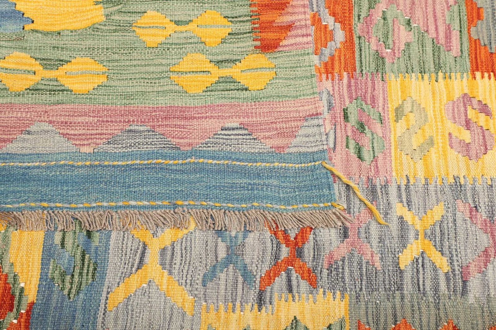 Die Verwendung von Kontrasten und harmonischen Farbtönen macht diesen Kelim zu einem echten Blickfang. Die abstrakten Muster können sowohl moderne als auch traditionelle Einrichtungsstile ergänzen, und die Schurwolle verleiht nicht nur eine ansprechende Optik, sondern auch ein angenehmes Körpergefühl.