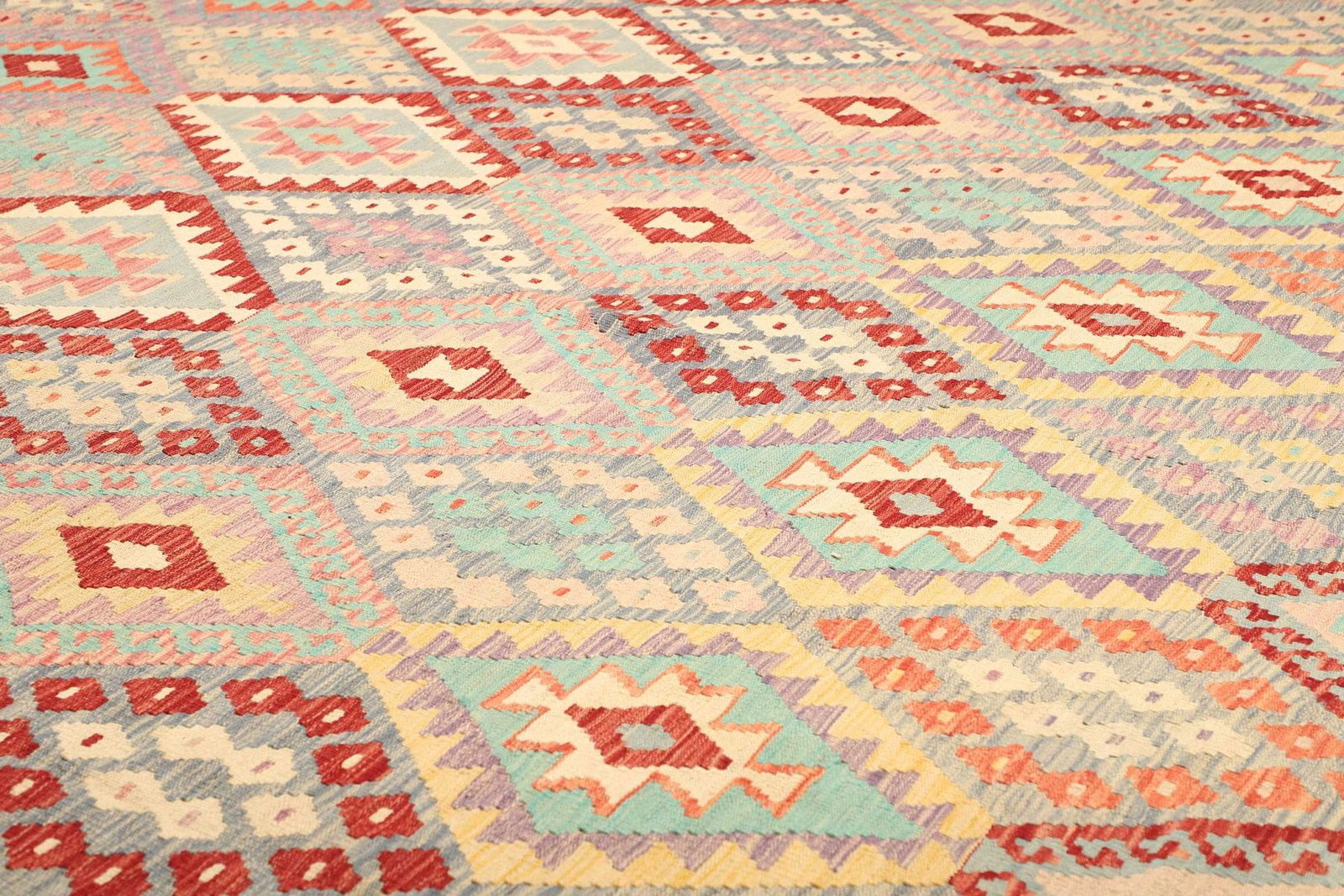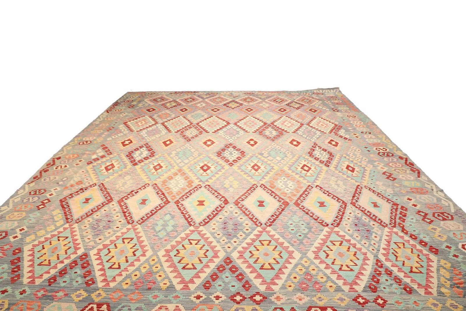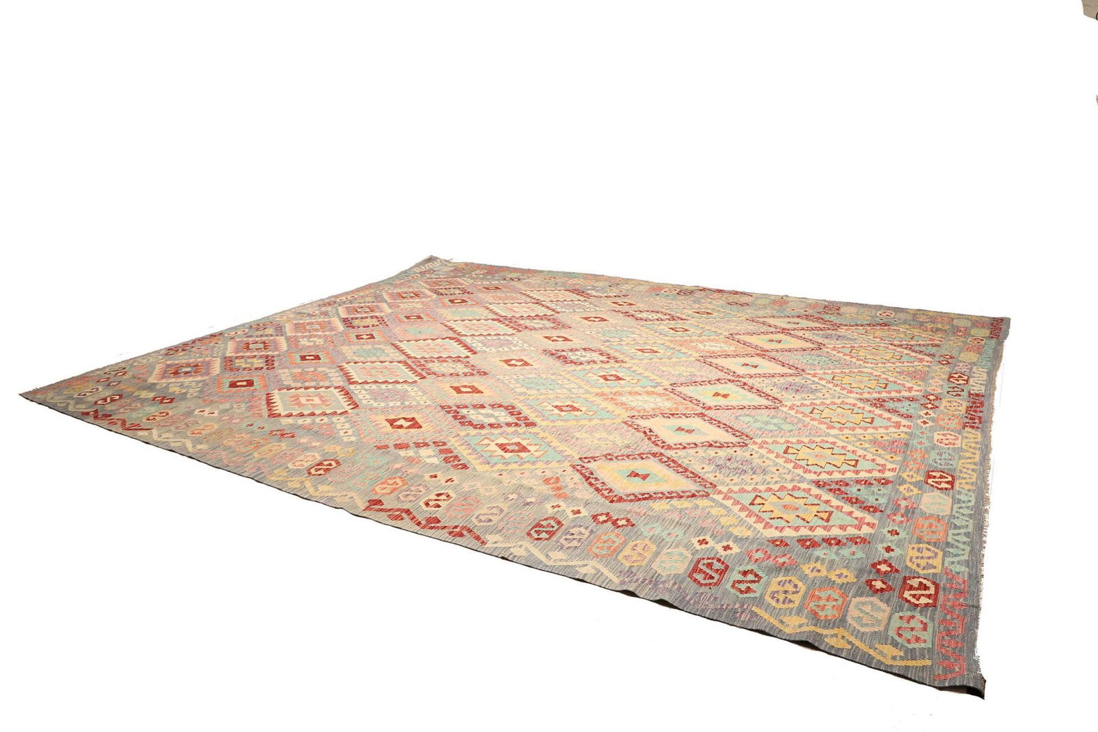 Kelim Teppich | Knotendichte: ca. 200.000 Knoten/m² | Material: 100% Schurwolle (Flor), 100% Baumwolle (Kette) | Größe: 371 x 442 cm | Handgewebte Qualität | Herkunft: Pakistan | Höhe: ca. 5 mm | Vielseitig einsetzbar, auch als Wandschmuck