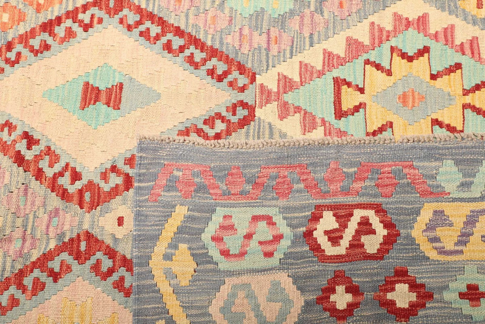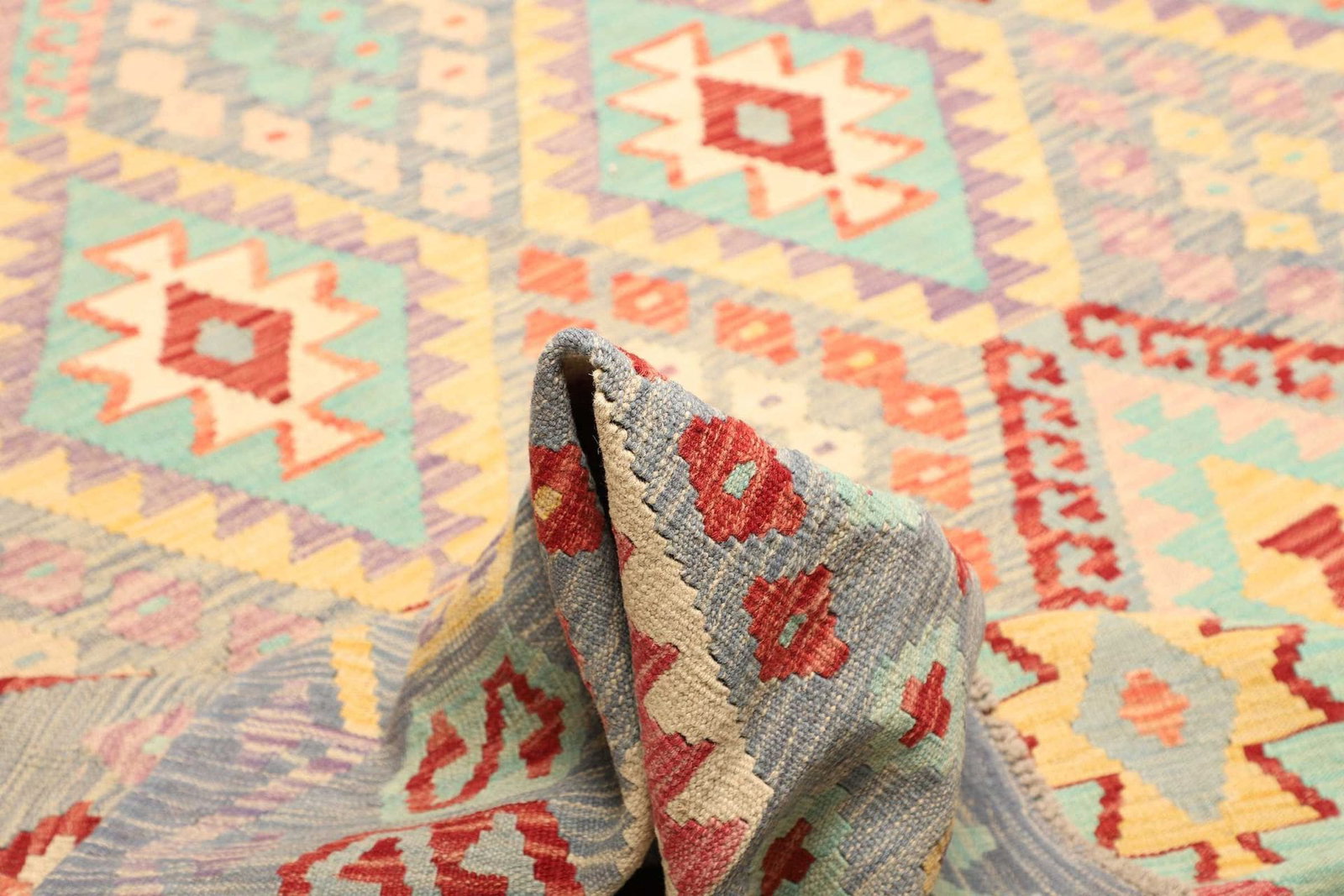 Der Kelim ist in erster Linie aus Wolle und Baumwolle gefertigt. Wolle ist bekannt für ihre hervorragenden Eigenschaften wie Strapazierfähigkeit, Pflegeleichtigkeit und Wärme. Baumwolle hingegen sorgt für eine angenehme Weichheit und einen hohen Komfort. Die Kombination dieser beiden Materialien macht unseren Kelim nicht nur schön, sondern auch funktional. Die handgewebte Technik verleiht diesem Teppich eine besondere Struktur und Haptik, die Sie spüren können, sobald Sie darauf treten.