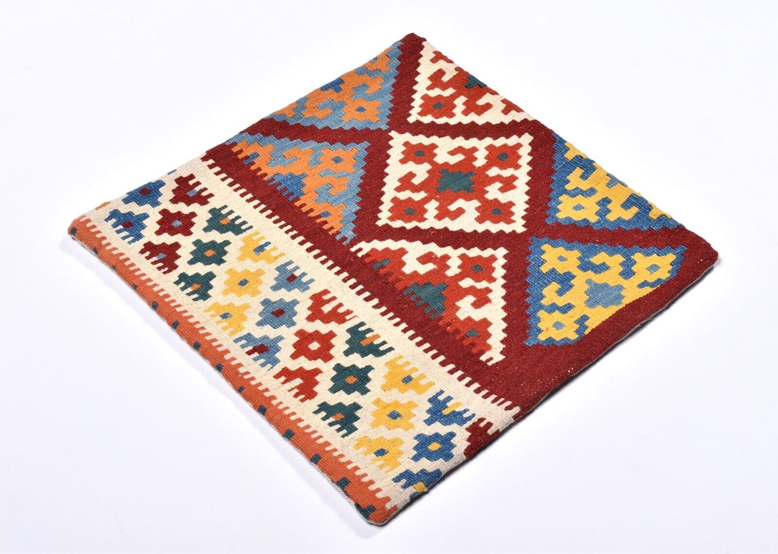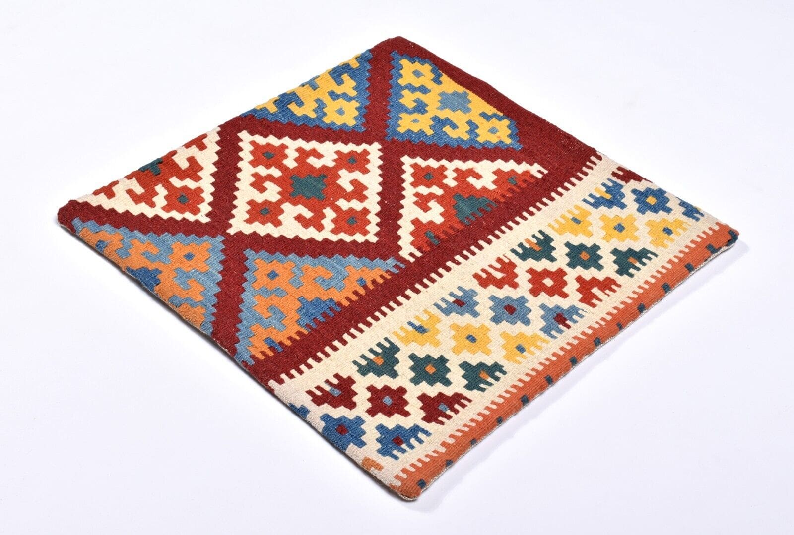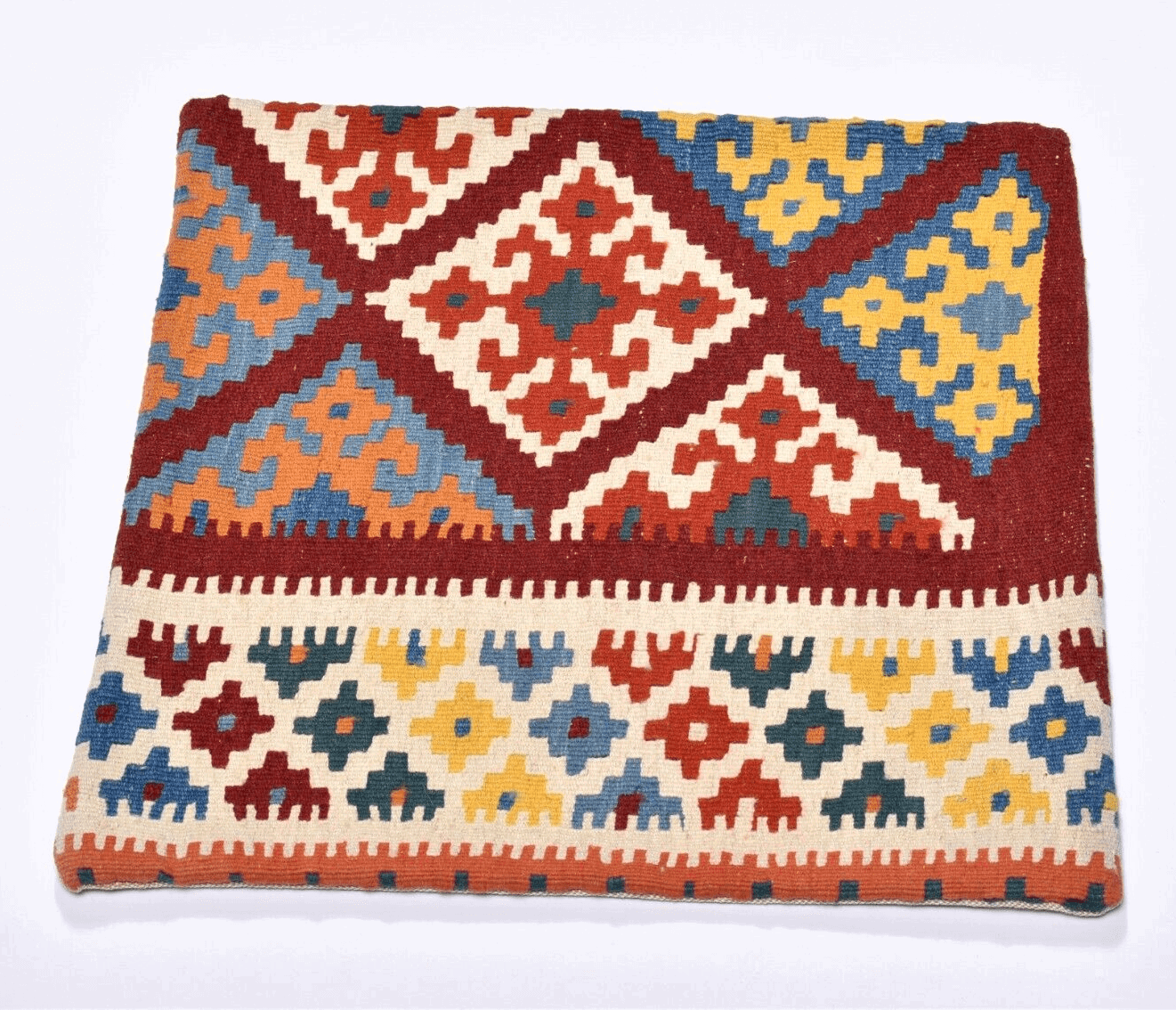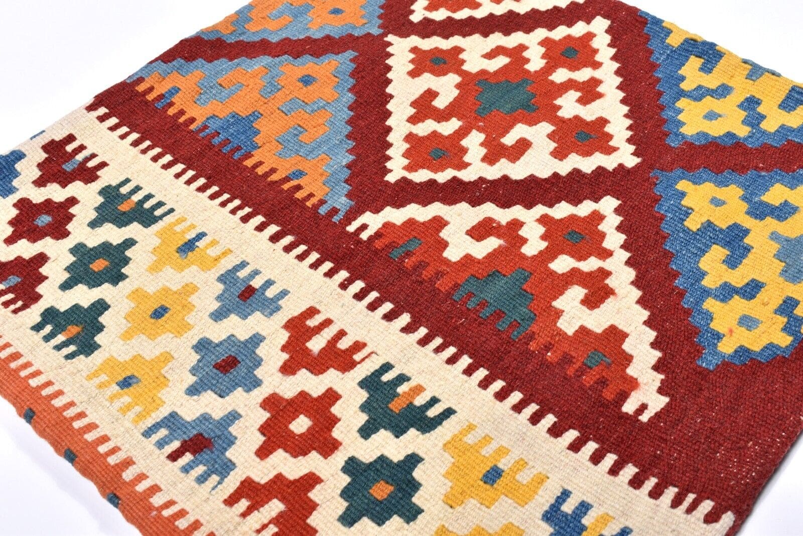 Handgewebtes Kelim Kissen | Größe: 50 x 50 cm | Material: 100% Schurwolle (Vorderseite), 100% Baumwolle (Rückseite) | Muster: Geometrisch | Zustand: Perfekt, unbenutzt | Herkunft: Persien, Nomadengebiet | Verschlussart: Reißverschluss | Alter: 10-20 Jahre | Einzigartiges Unikat | Geeignet für verschiedene Räume: Wohnzimmer, Schlafzimmer, Flur, u.v.m.