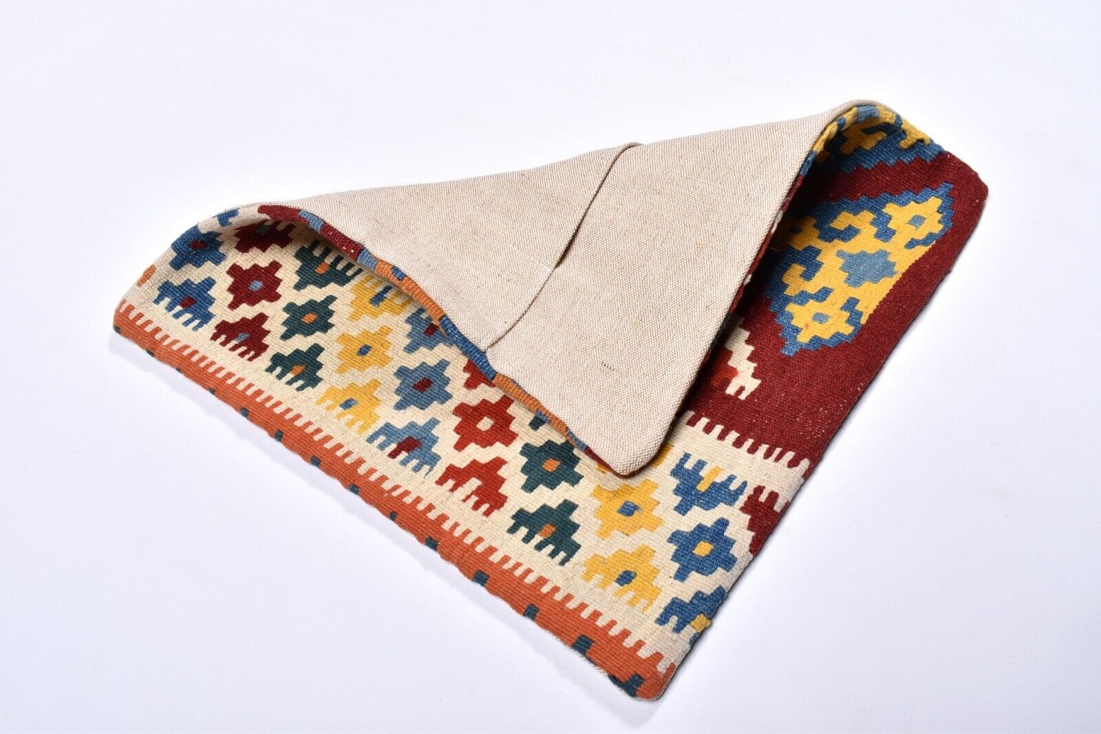 Die handgewebte Technik, die bei der Herstellung dieses Kissens zum Einsatz kommt, ist ein traditionelles Verfahren, das seit Jahrhunderten praktiziert wird. Die Kunst des Kelim-Webens erfordert viel Geschick und Erfahrung, die von Generation zu Generation weitergegeben wird. Bei der Herstellung werden keine Maschinen verwendet, sondern ausschließlich traditionelle Webstühle und die Hände der Kunsthandwerker. Dies sorgt für ein unverwechselbares Produkt, das die individuelle Handschrift des jeweiligen Kunsthandwerkers trägt.