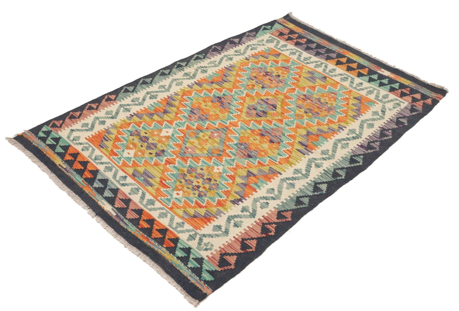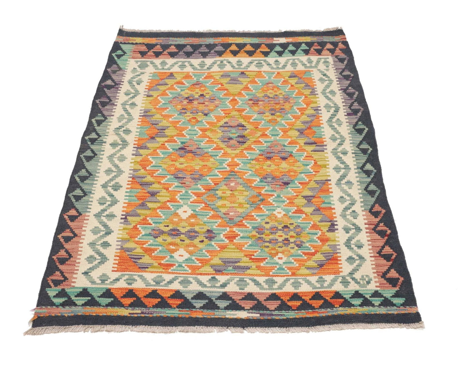 Kelim Teppich | Größe: 100 x 148 cm | Knotendichte: ca. 200.000 Knoten/m² | Flor: 100% Schurwolle | Kette: 100% Baumwolle | Herkunft: Pakistan | Verarbeitung: Handgewebt | Höhe: ca. 5 mm | Vielseitig einsetzbar: auch als Vorhang oder Kissen geeignet