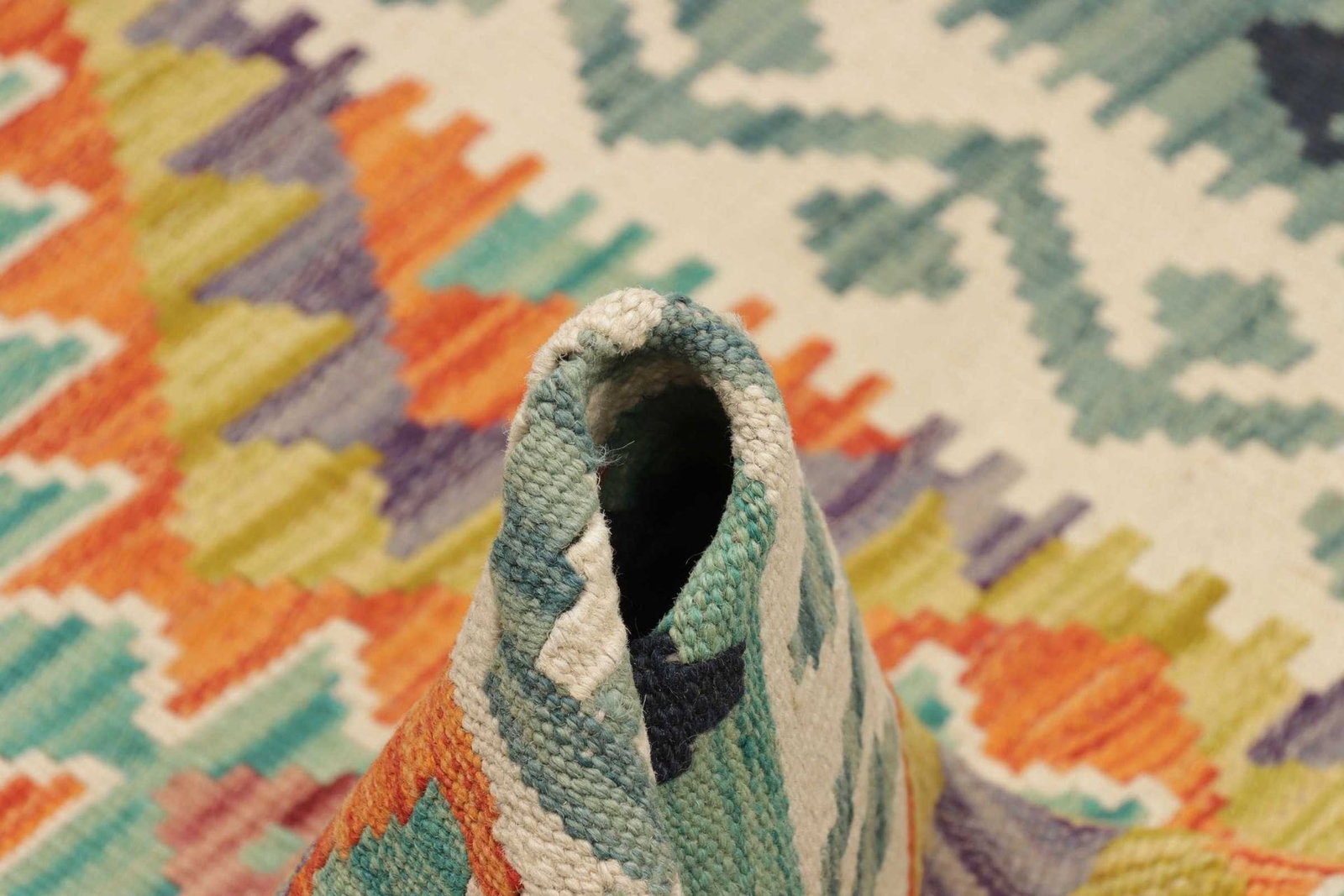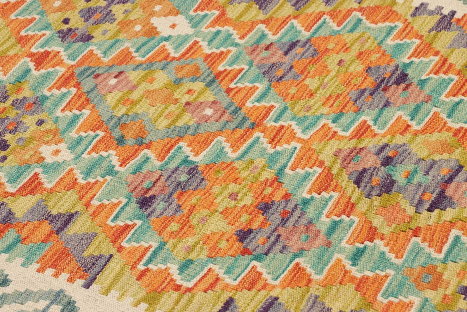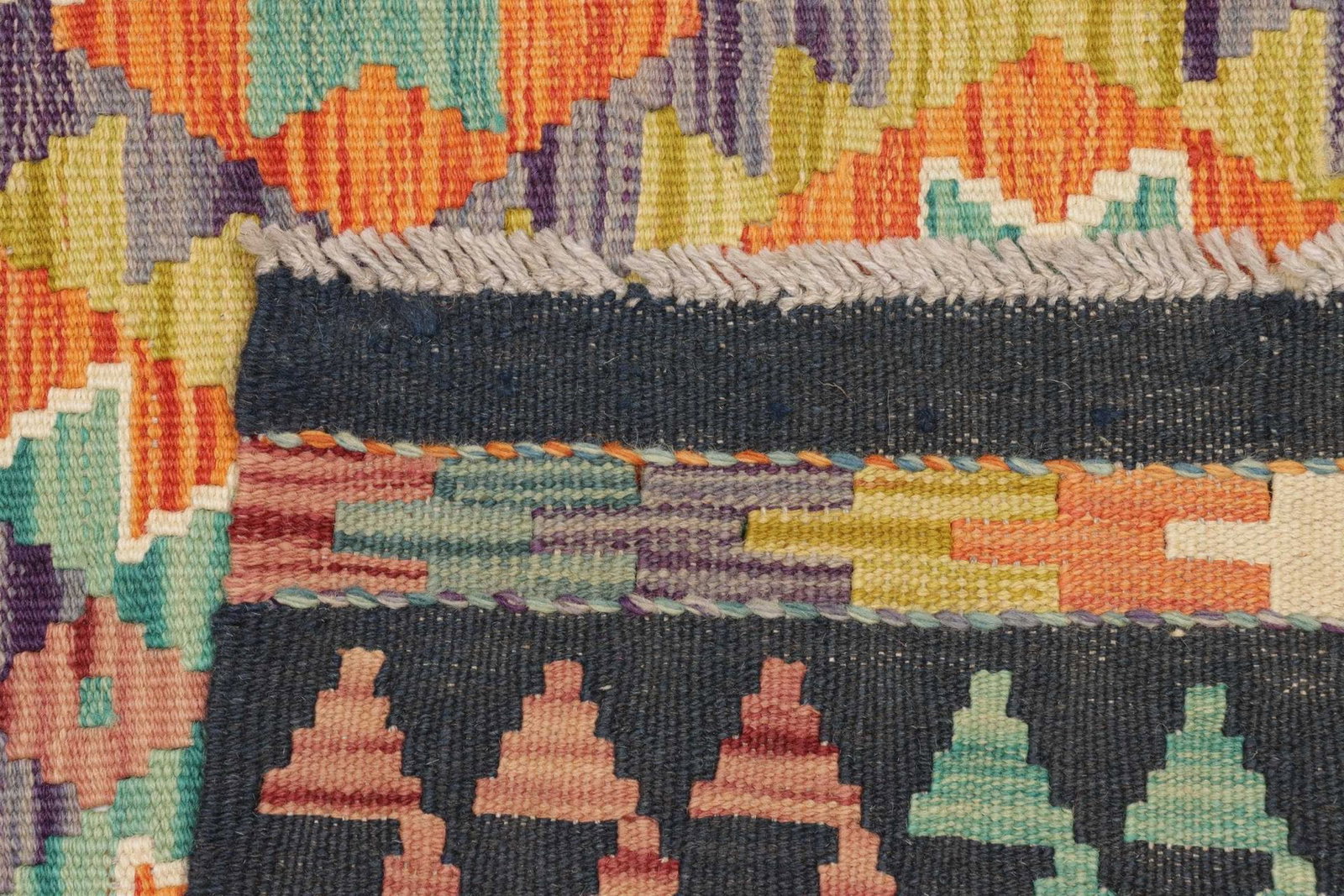 Die Muster auf diesem Kelim Teppich sind tief verwurzelt in der Geschichte und Symbolik der jeweiligen Kultur. Die geometrischen Formen und kräftigen Farben können zahlreiche Bedeutungen tragen, von Fruchtbarkeit bis zu Schutz vor bösen Geistern. Dieser Teppich stellt nicht nur ein dekoratives Element dar, sondern erzählt auch eine Geschichte und wertet die Räumlichkeiten auf. Kelim Teppiche sind vielseitig einsetzbar und passen sowohl in moderne als auch in traditionelle Einrichtungsstile.