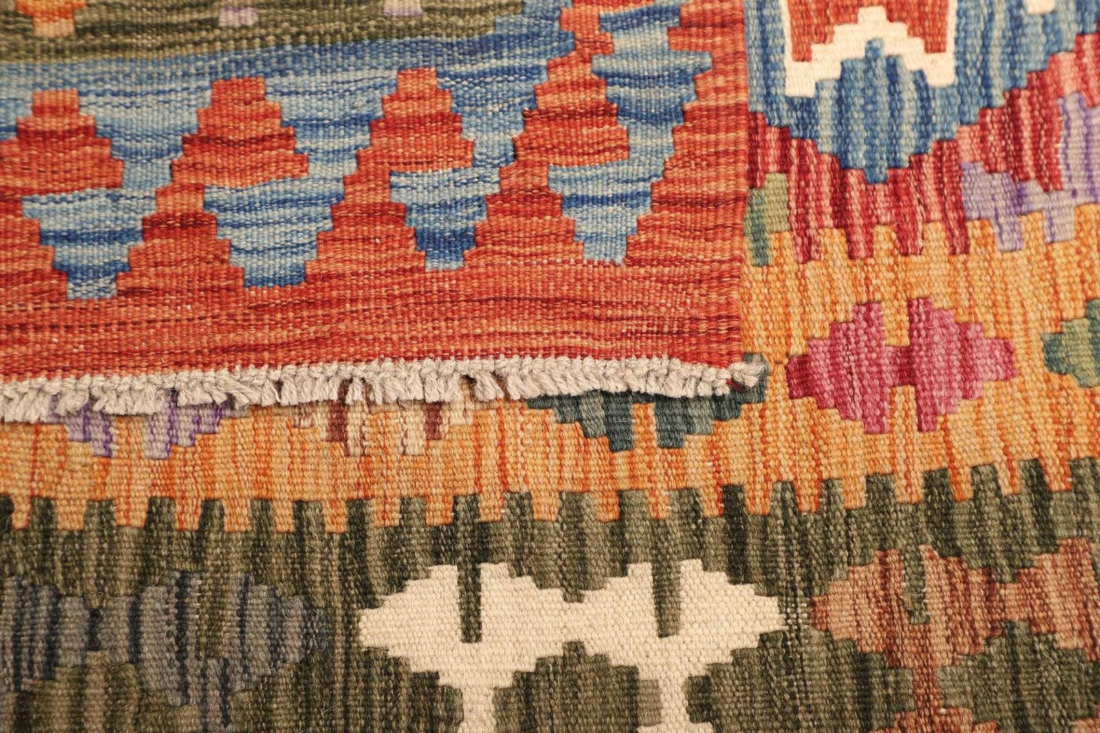 1446$ In den WarenkorbKelim 216 x 128 cm – Handgewebt mit doppeltem Muster auf Vorder- und Rückseite – Traditioneller Wandschmuck – Handgeknüpft – Orientteppich