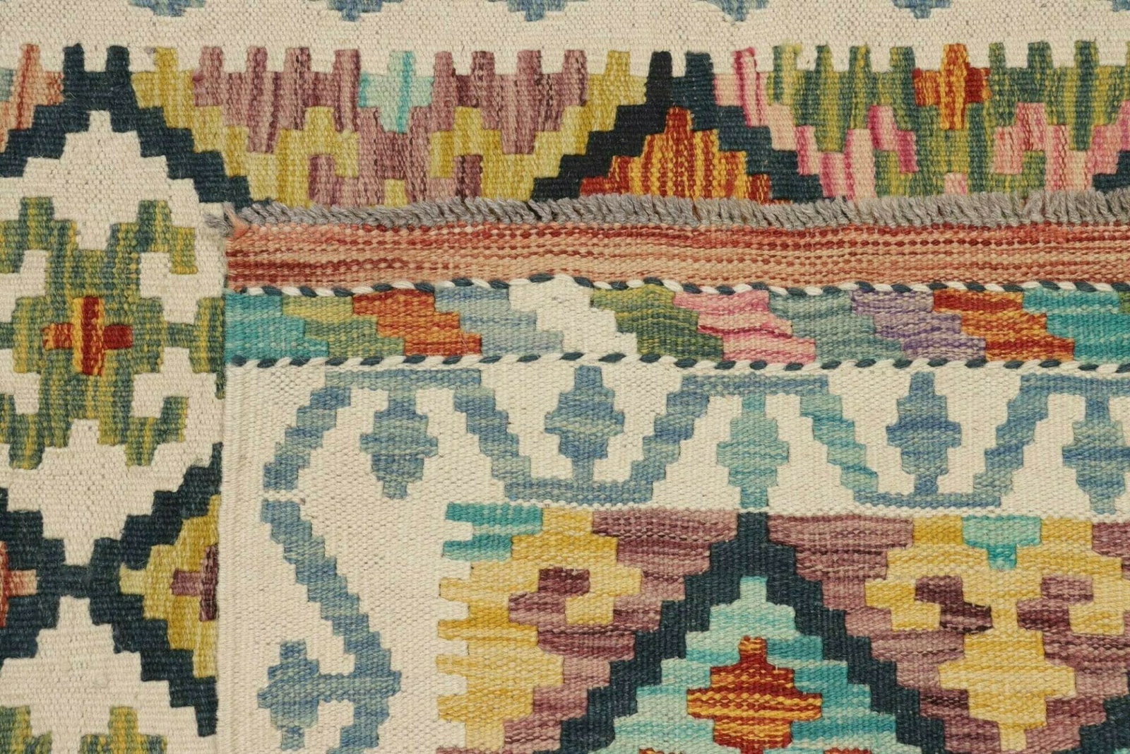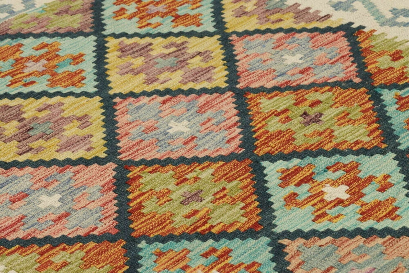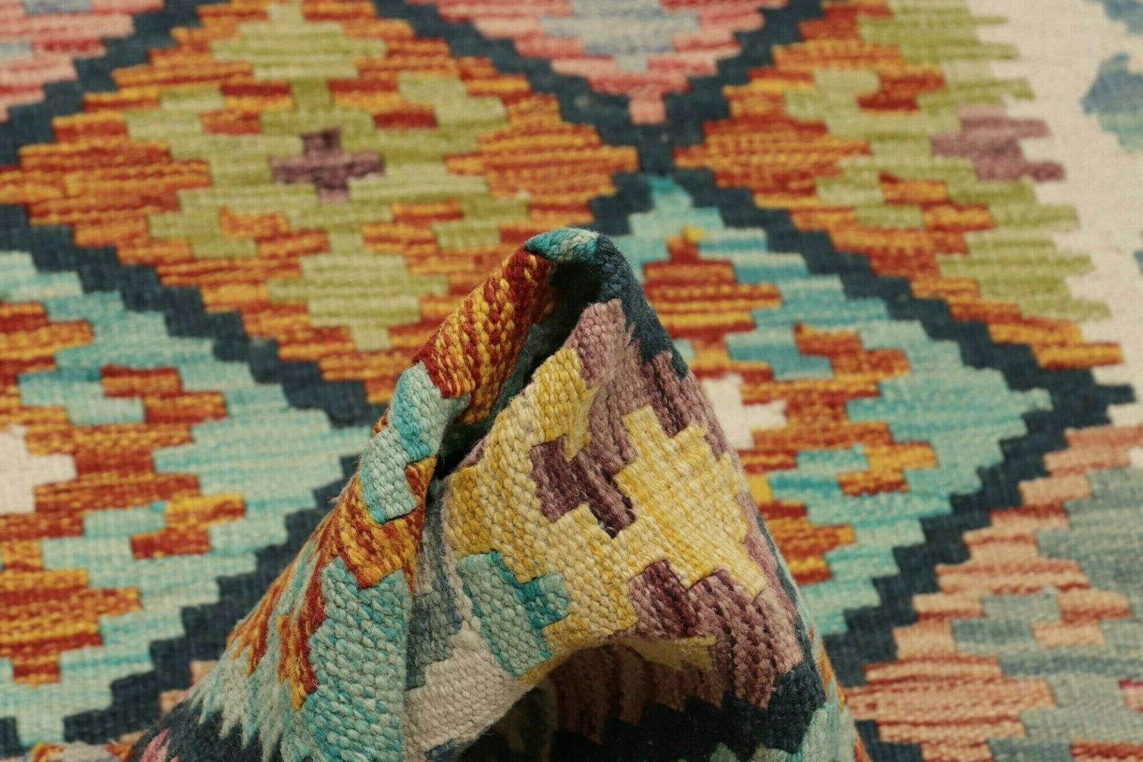 Neben der optischen Anziehungskraft bietet dieser handgewebte Kelim Teppich auch außerordentliche praktische Vorteile. Er ist leicht zu reinigen und pflegen, was ihn ideal für Haushalte mit Kindern oder Haustieren macht. Darüber hinaus fördert die Verwendung von Naturmaterialien wie Schurwolle ein gesundes Raumklima, da atmungsaktive Stoffe verwendet werden, die allergiearm sind und die Luftqualität nicht beeinträchtigen.