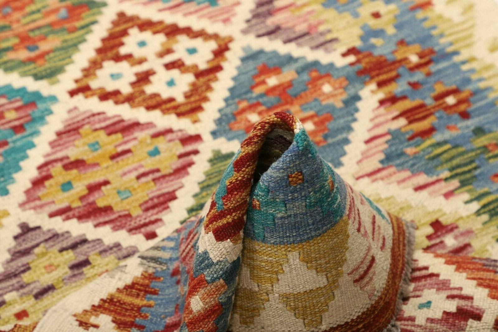 Der Teppich besteht aus reiner Schurwolle, einem der besten Materialien für Teppiche, bekannt für seine Langlebigkeit und Widerstandsfähigkeit. Wolle ist nicht nur angenehm weich und warm, sondern hat auch die Fähigkeit, Feuchtigkeit zu regulieren und Allergene zu reduzieren, wodurch der Teppich besonders für Allergiker geeignet ist. Die handgewebte Technik sorgt dafür, dass jeder Teppich ein Unikat ist. Die Knotendichte ist typisch für Kelim-Teppiche und verbessert die Robustheit und Haltbarkeit des Produkts.