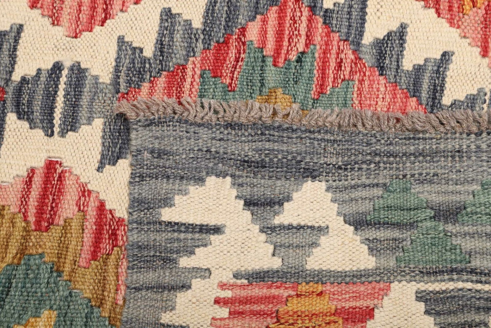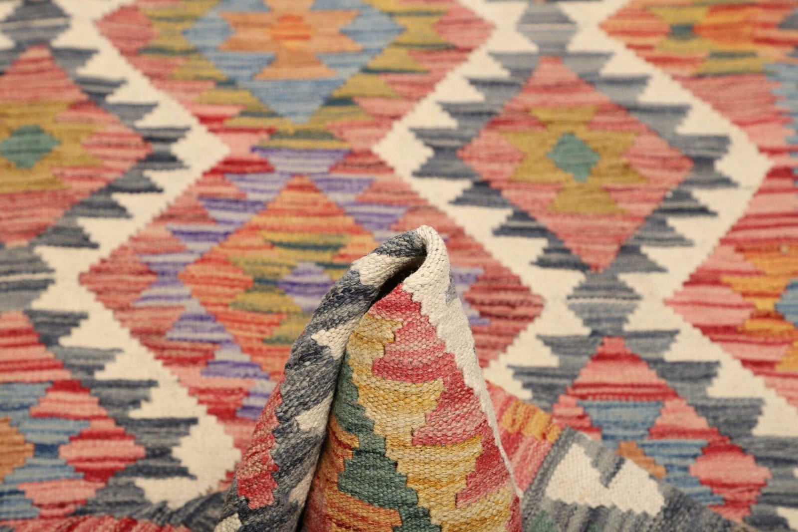 Ein herausragendes Merkmal dieses handgewebten Kelim Teppichs ist seine Leichtigkeit und Vielseitigkeit. Er bietet eine ideale Grundlage für verschiedene Einrichtungsstile – von rustikal bis modern. Darüber hinaus ist der Teppich pflegeleicht, was ihn zu einer praktischen Wahl für stark frequentierte Bereiche in Ihrem Zuhause macht. Durch die Verwendung von natürlichen Materialien kann der Teppich auch zur Verbesserung der Raumluftqualität beitragen.