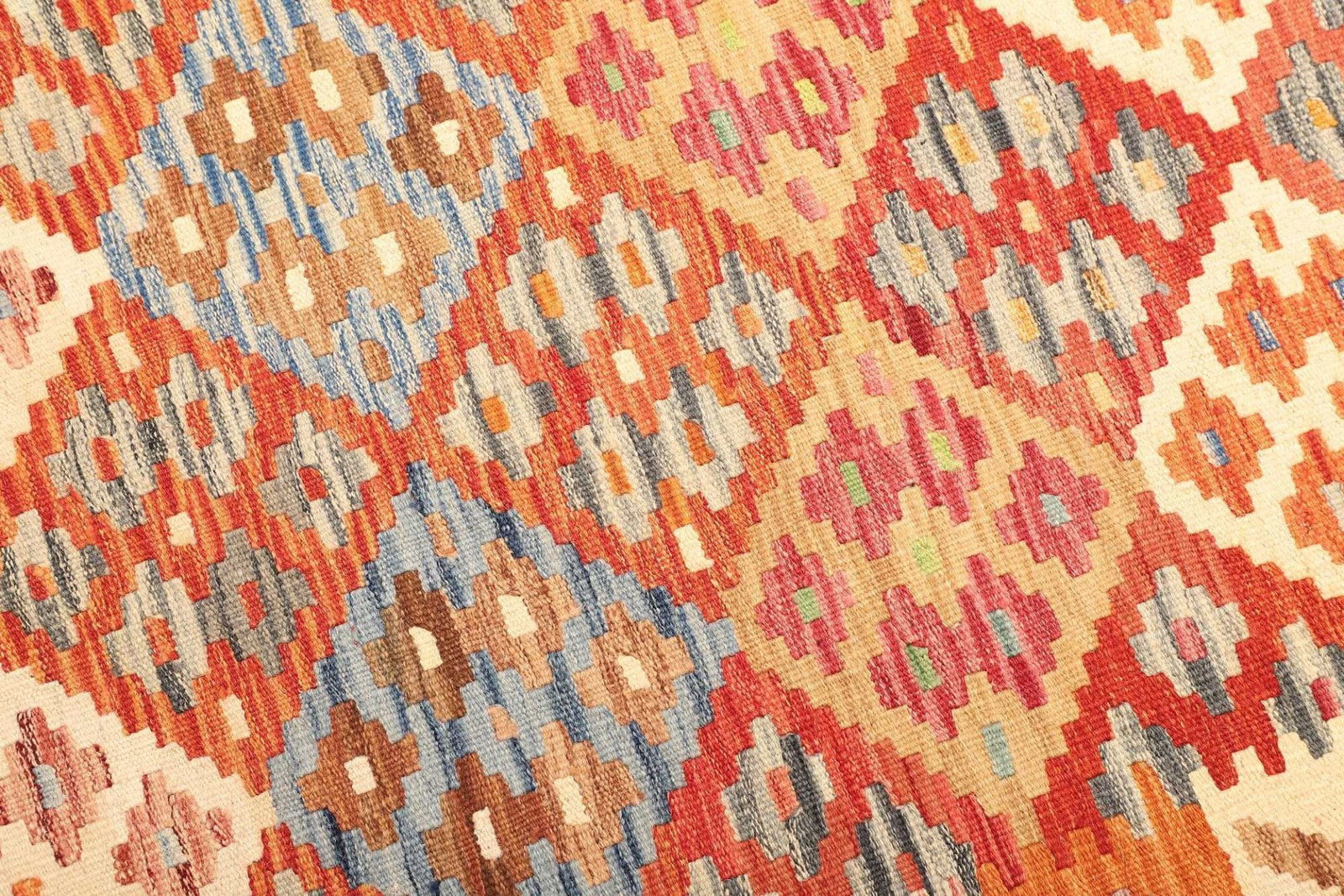 Der Kelim Teppich ist aus reinem Schurwolle gefertigt, was ihn besonders weich und angenehm macht. Wolle ist nicht nur ein langlebiges Material, sondern bietet auch natürliche Isolierung und Pflegeleichtigkeit. Die handgewebte Technik, die für diese Art von Teppichen typisch ist, sorgt dafür, dass jeder Teppich ein Unikat ist. Durch das Weben entsteht eine flache Struktur, die dem Teppich eine gewisse Leichtigkeit verleiht und ihn ideal für Fußböden macht. Die Knotendichte ist optimiert, um sowohl Stabilität als auch Flexibilität zu garantieren, sodass der Teppich in verschiedenen Wohnbereichen eingesetzt werden kann.