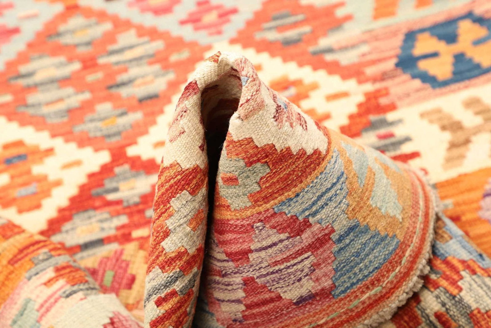 Ein besonderer Aspekt des Kelim Teppichs ist seine Vielseitigkeit. Er kann sowohl in modernen als auch in traditionellen Einrichtungsstilen eingesetzt werden. Die flache Webart macht ihn zu einer idealen Wahl für Fußbodenheizungen oder auch als Wandbehang. Zudem ist der Teppich pflegeleicht und kann mit einem herkömmlichen Staubsauger gereinigt werden. Seine natürliche Farbgebung und die nachhaltige Produktion zeichnen ihn als umweltfreundliche Wahl aus.