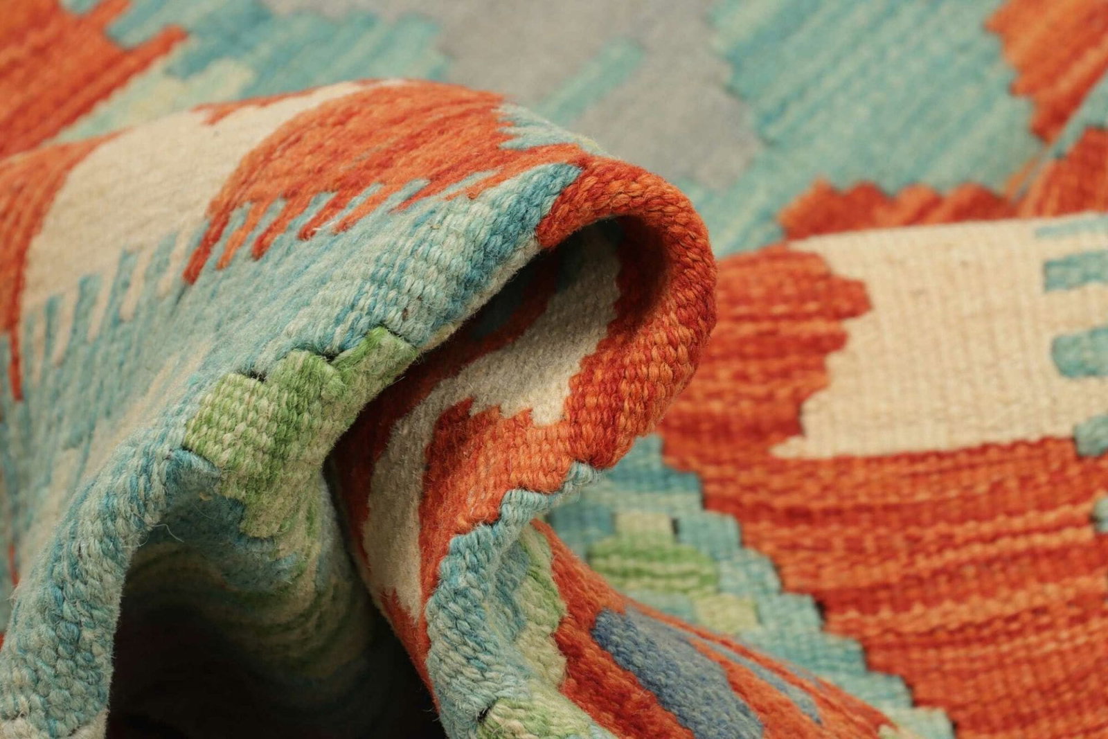 Ein herausragendes Merkmal dieses handgewebten Kelim Teppichs ist die Knotendichte, die nicht nur auf die Qualität des Teppichs hinweist, sondern auch die Langlebigkeit beeinflusst. Die Kombination aus robuster Wolle und traditioneller Webtechnik stellt sicher, dass der Teppich auch bei intensiver Nutzung seine Form und Farbe behält.
