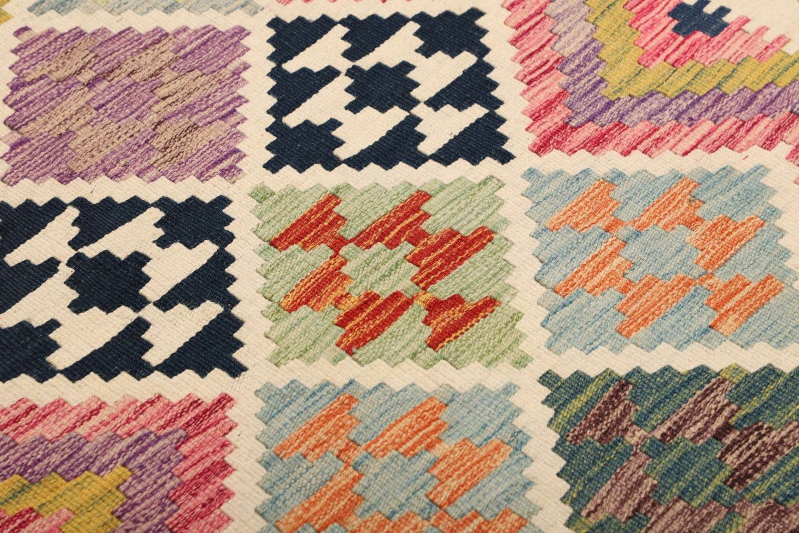 Der Kelim Teppich besteht aus 100% Wolle, einem Material, das für seine Langlebigkeit und Robustheit bekannt ist. Wolle hat zusätzlich den Vorteil, dass sie temperatur- und feuchtigkeitsregulierend wirkt, wodurch der Teppich auch in unterschiedlichen klimatischen Bedingungen beständig bleibt. Die handgewebte Verarbeitung ist eine alte Kunstform, die viel Geschick und Erfahrung erfordert. Hierbei werden die verschiedenen Farbfäden miteinander verwoben, ohne dass dabei ein Hochflor entsteht, was dem Kelim seinen charakteristischen flachen, dichten und strapazierfähigen Charakter verleiht.