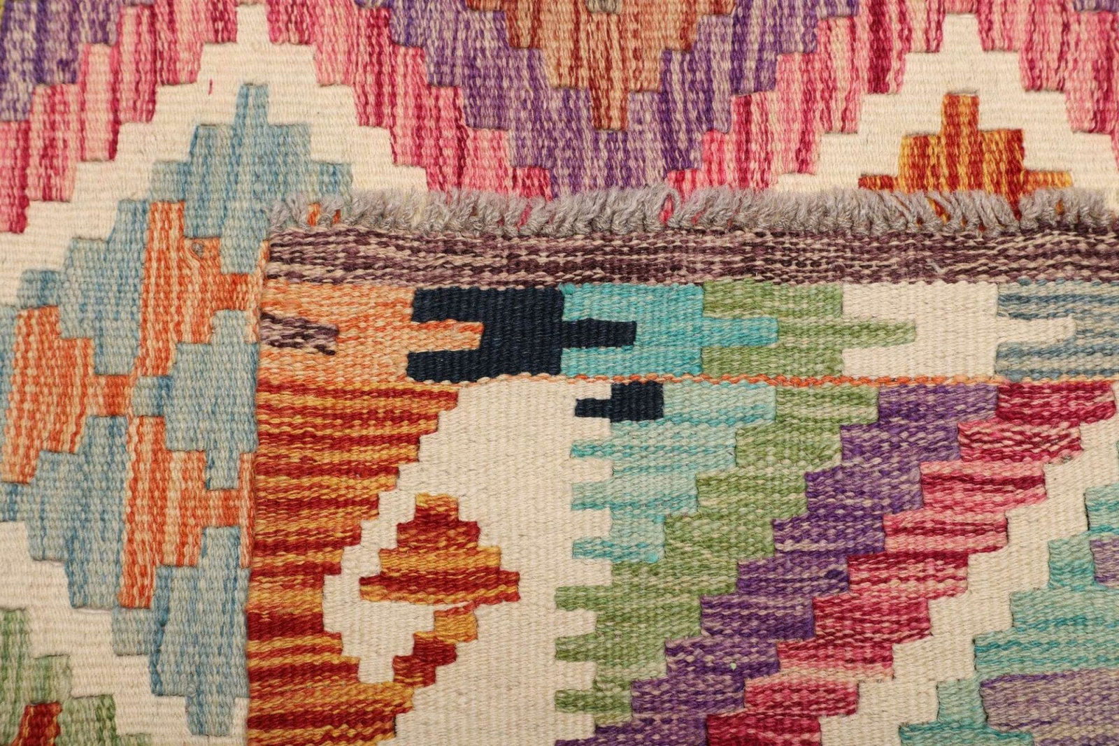 Echter handgewebter Kelim zeigt oft Unregelmäßigkeiten im Muster und der Struktur, was auf die manuelle Fertigung hinweist. Achten Sie auch auf die Materialqualität: Hochwertige Wolle fühlt sich weich und langlebig an. Ein authentischer Kelim hat keine Knoten auf der Rückseite, was ein typisches Merkmal des handgewebten Teppichs ist.