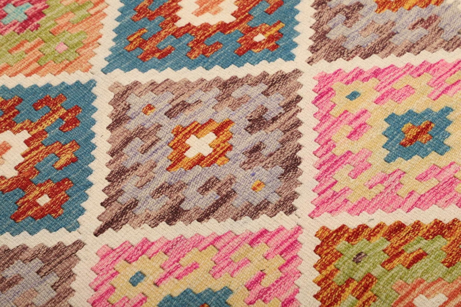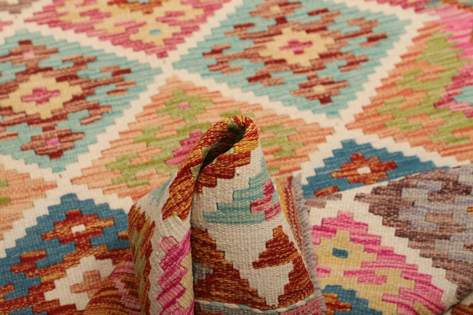 Die Verwendung von hochwertigen Materialien ist ein Markenzeichen dieses handgewebten Kelim Teppichs. Hergestellt aus reiner Wolle, bietet dieser Teppich sowohl Weichheit als auch Widerstandsfähigkeit. Wolle ist bekannt für ihre isolierenden Eigenschaften und ihre Fähigkeit, Farben lebendig und strahlend zu halten, was bedeutet, dass Ihr Teppich auch nach vielen Jahren Gebrauch noch frisch und ansprechend aussieht. Die handgewebte Technik verleiht dem Teppich eine angenehme Struktur und sorgt dafür, dass jeder Teppich ein Unikat ist, das durch die geschickten Hände erfahrener Weber entstanden ist.