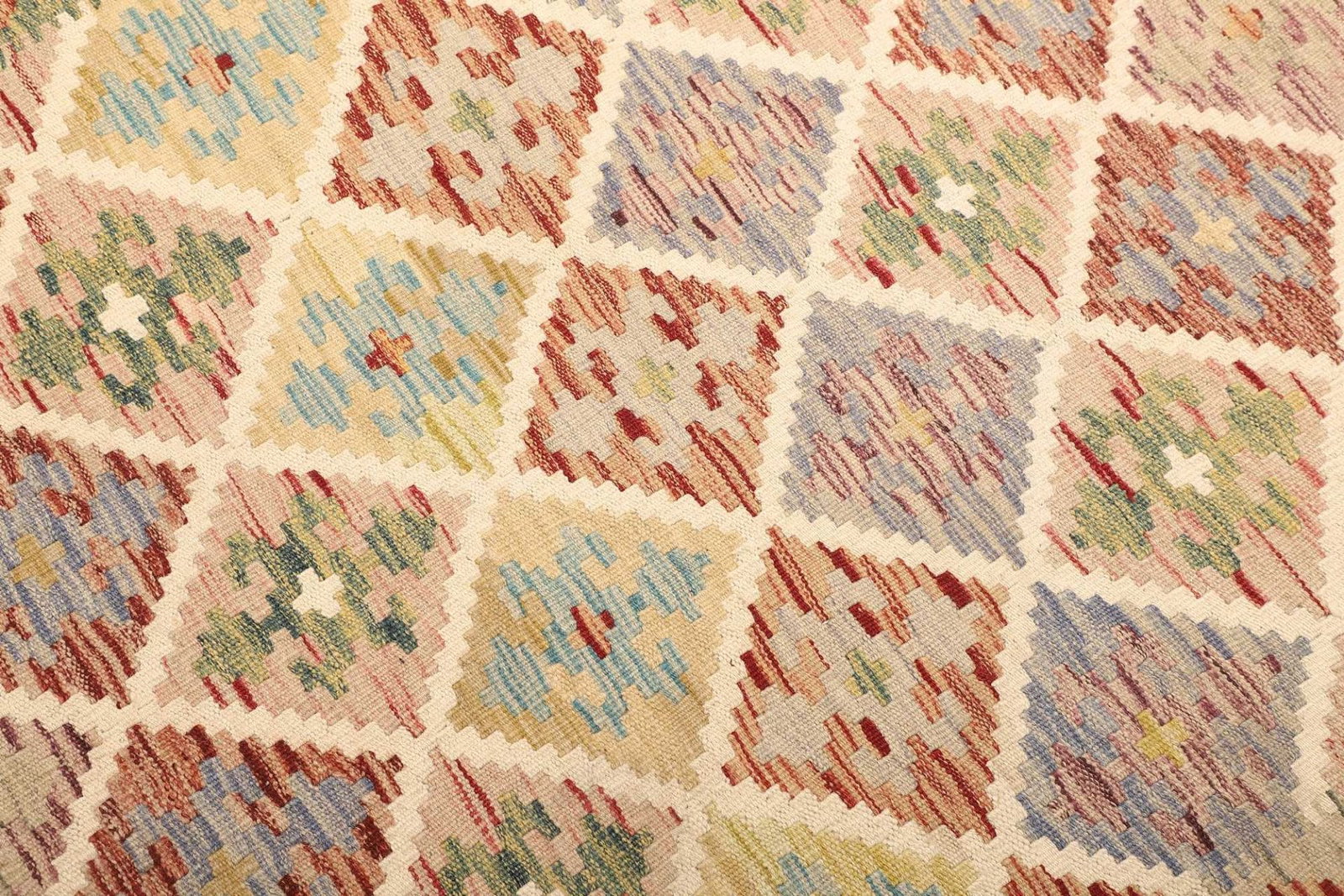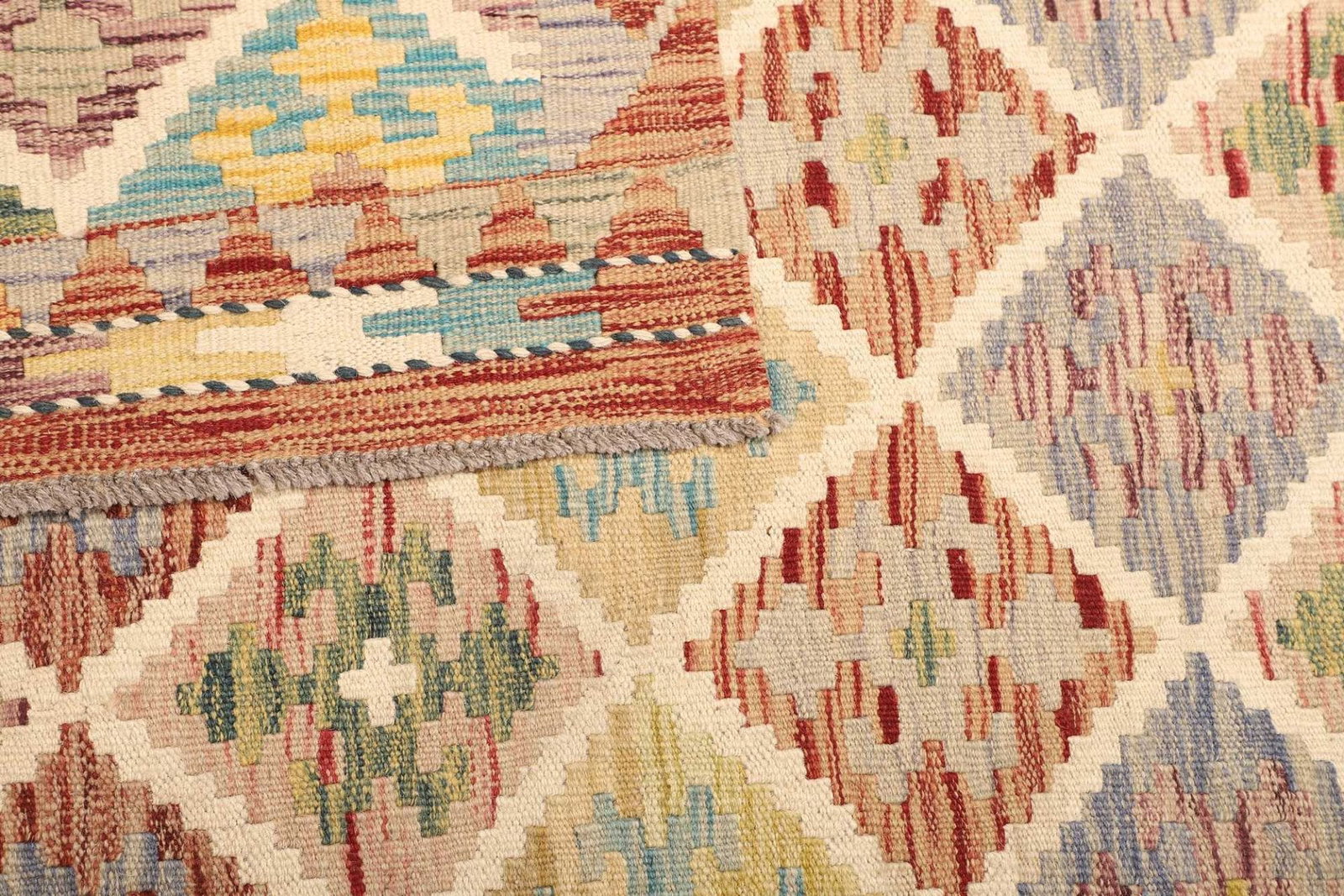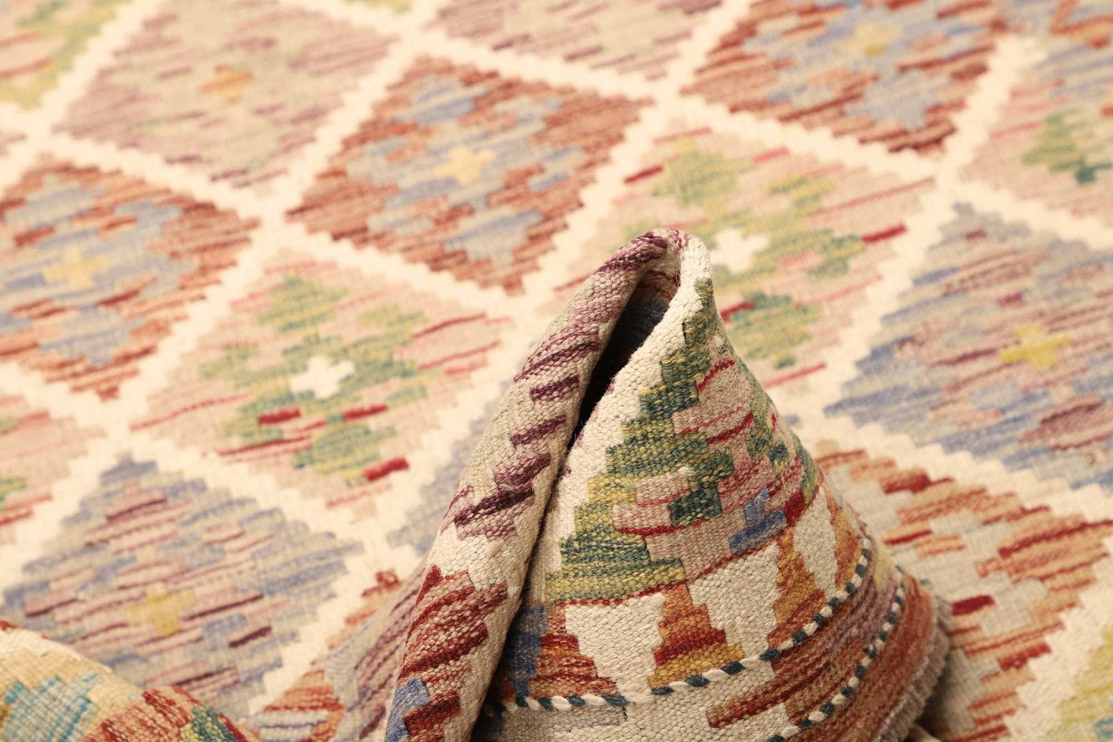Die Tradition des Kelim-Webens hat ihre Wurzeln in der orientalischen Kultur und wird seit Jahrhunderten in verschiedenen Ländern praktiziert. Dieser Teppich stammt aus einer Region mit reicher Teppichtradition, die für ihre farbenfrohen Designs und zeitlosen Muster bekannt ist. Die Kunst des Kelim-Webens wird oft von Generation zu Generation weitergegeben, wobei jede Familie eigene Techniken und Muster entwickelt hat, die die persönliche Handschrift betonen.