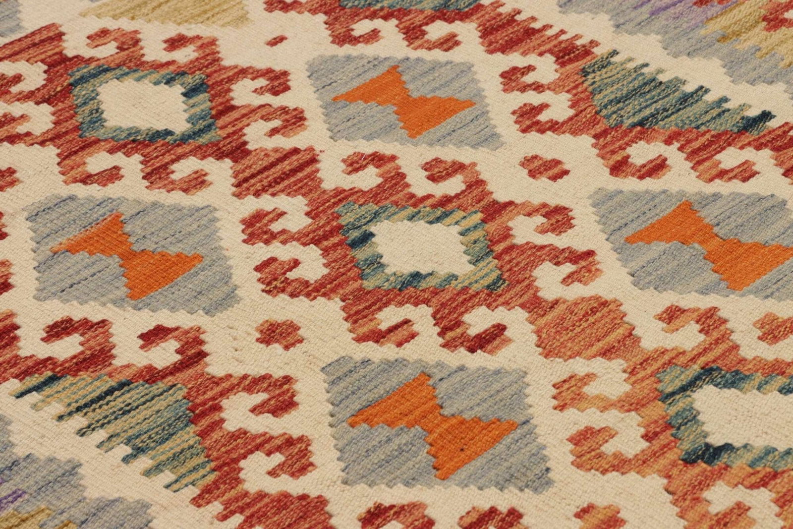Dieser Kelim Teppich wird aus feinstem, handgefertigtem Schurwollgarn hergestellt, das für seine Weichheit und Wärme bekannt ist. Schurwolle ist besonders robust und sorgt dafür, dass der Teppich auch in hochfrequentierten Wohnräumen seinen Charme und seine Struktur behält. Durch die handgewebte Verarbeitung sind die Farben strahlend und die Muster klar definiert, was dem Teppich eine besonders ansprechende Ästhetik verleiht. Zudem sorgt die natürliche Atmungsaktivität der Wolle dafür, dass der Teppich auch in Sachen Hygiene und Pflegebedürfnis kaum Ansprüche stellt.