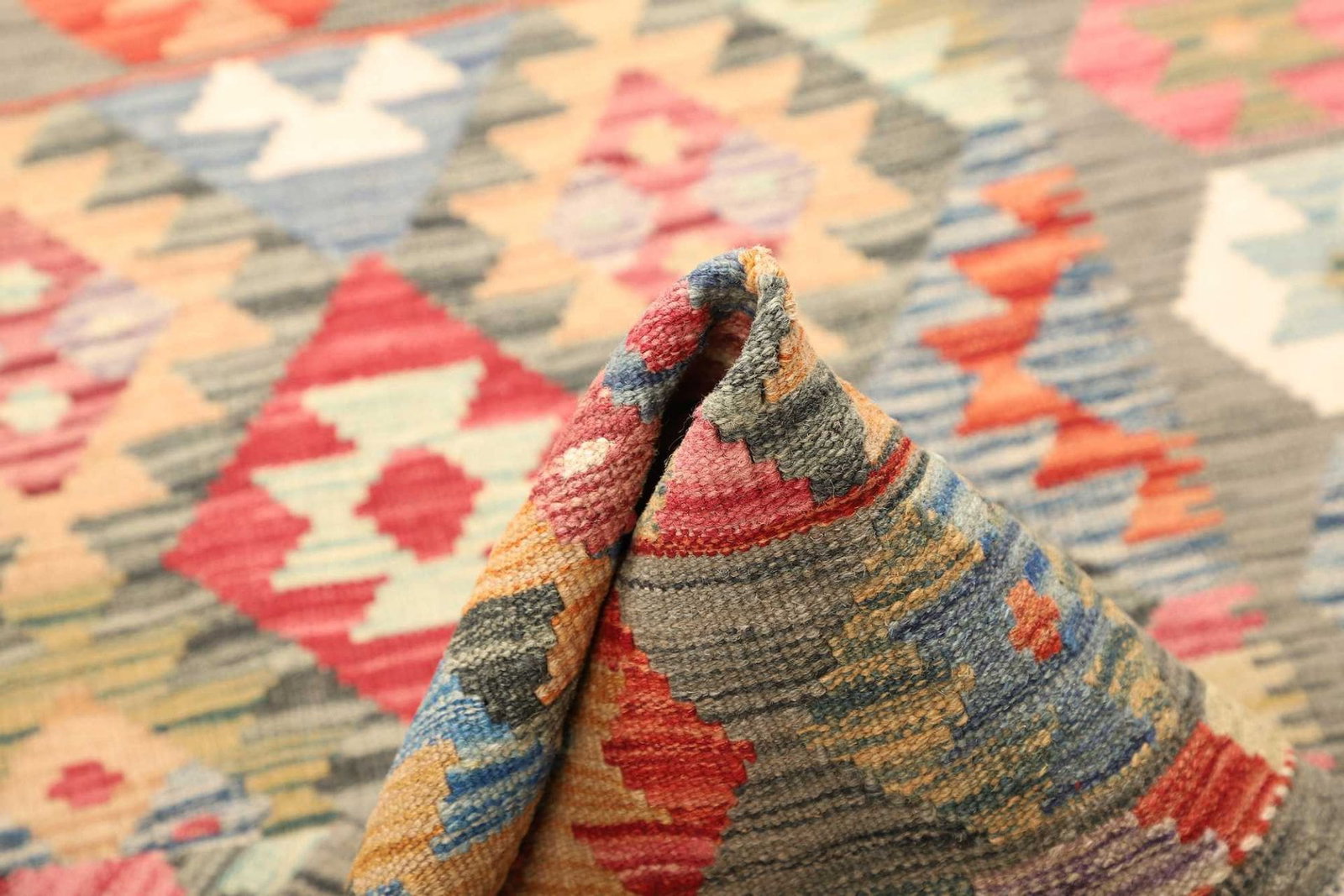 Der Kelim Teppich ist aus hochwertiger Schurwolle gefertigt, die für ihre Langlebigkeit und Atmungsaktivität bekannt ist. Schurwolle hat nicht nur hervorragende isolierende Eigenschaften, die zur Regulierung der Raumtemperatur beitragen, sondern ist auch von Natur aus schmutzabweisend und pflegeleicht. Die handgewebte Technik sorgt dafür, dass jeder Teppich ein Unikat ist, das mit größter Sorgfalt und Präzision hergestellt wurde. Die knotendichte, die typischerweise bei Kelim-Teppichen weniger ausgeprägt ist als bei handgeknüpften Teppichen, verleiht diesem Produkt eine flache, strukturierte Oberfläche, die sowohl weich als auch robust ist.