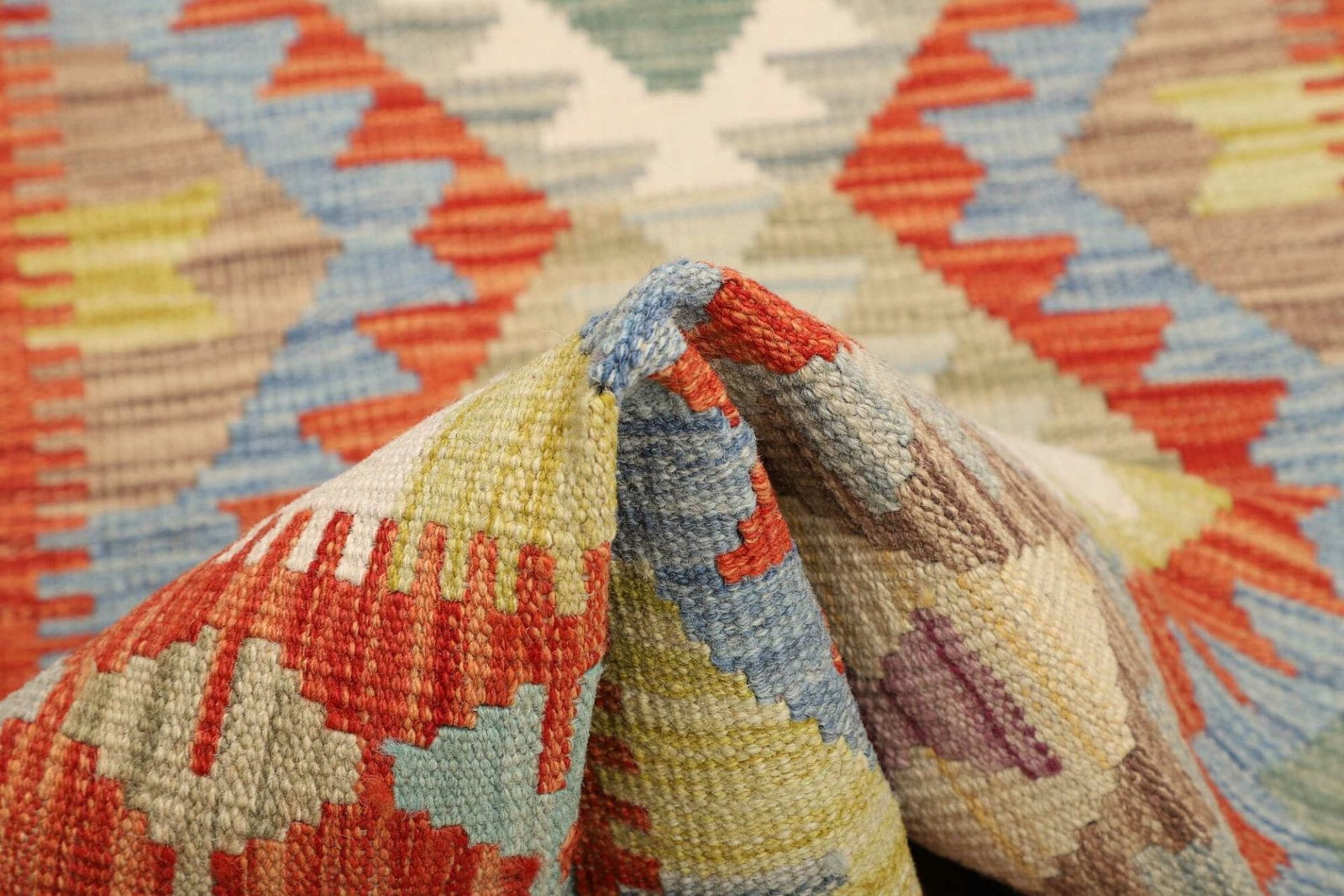 Ein handgewebter Kelim Teppich wie dieser bringt nicht nur Schönheit in Ihr Zuhause, sondern auch eine Geschichte und Tradition. Jeder Teppich ist einzigartig und trägt die Handschrift des Webers. Durch die Verwendung reiner Schurwolle verbessert dieser Teppich zudem das Raumklima und sorgt für eine angenehme Wärme. Seine korrekte Pflege und Pflegeleichtigkeit machen ihn zudem zu einer praktischen Wahl für moderne Haushalte.