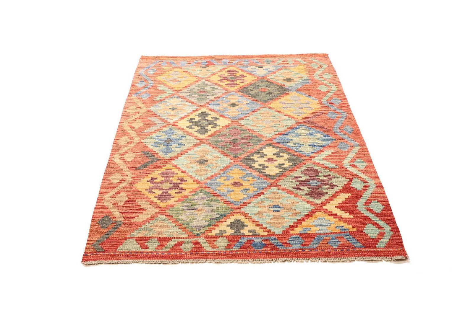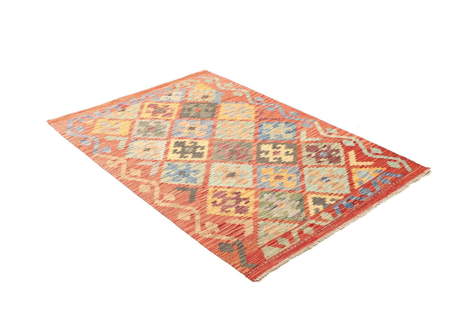 Kelim Teppich | Größe: 105 x 150 cm | Knotendichte: ca. 200.000 Knoten/m² | Flor: 100% Schurwolle | Kette: 100% Baumwolle | Herkunft: Pakistan | Verarbeitung: Handgewebt | Höhe: ca. 5 mm | Vielseitig einsetzbar als Teppich, Vorhang oder Wandschmuck
