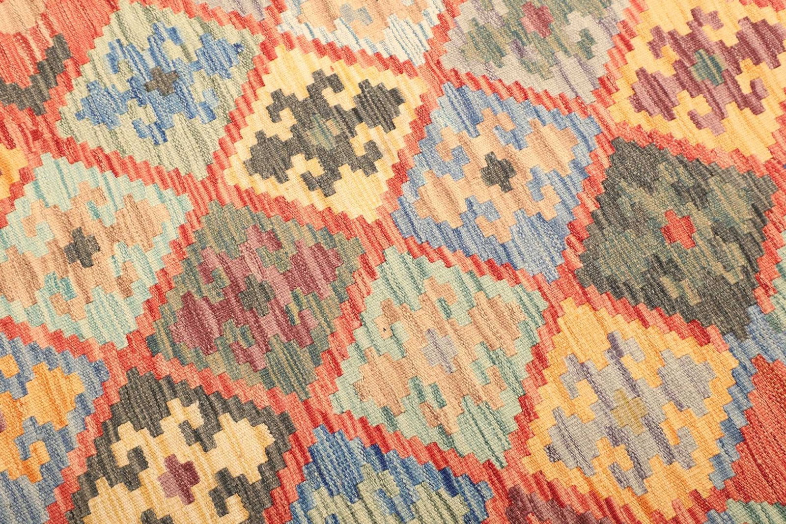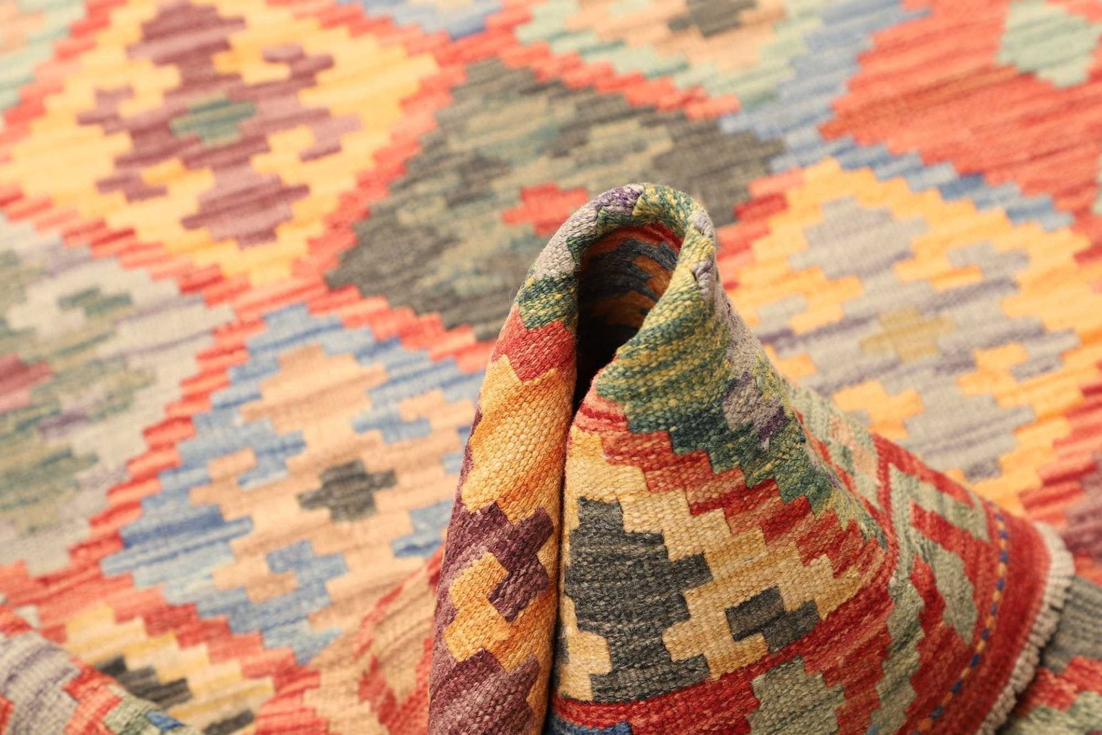 Die Besonderheit dieses Kelim Teppichs liegt nicht nur in seinen ästhetischen Qualitäten, sondern auch in der Tatsache, dass er umweltfreundlich und nachhaltig ist. Wolle ist ein nachwachsender Rohstoff, der bei richtiger Pflege eine lange Lebensdauer hat. Zudem besitzt Wolle natürliche Eigenschaften zur Schmutzabweisung und ist schwer entflammbar, was die Sicherheit in Ihrem Wohnraum erhöht.