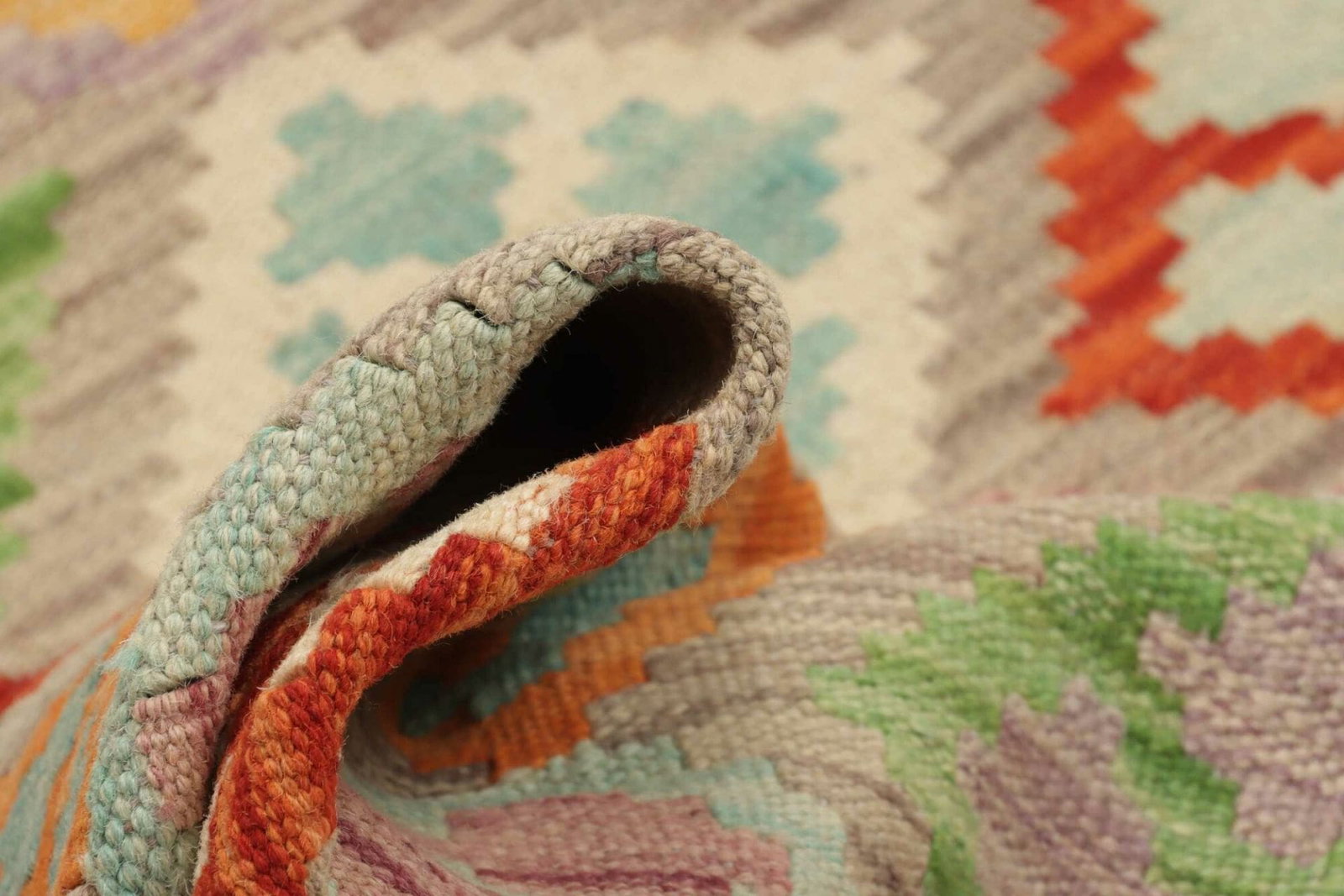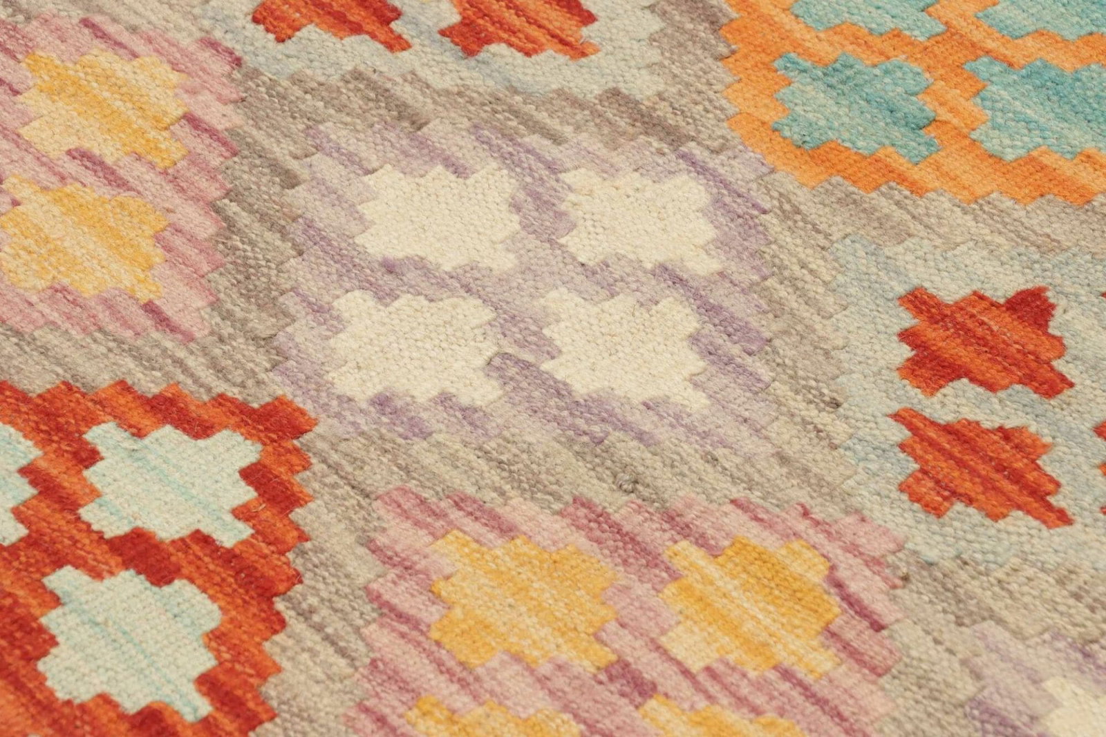 Die handgewebte Technik des Kelims verleiht dem Teppich eine flache Textur und ein leichtes Gewicht. Dies macht ihn besonders vielseitig einsetzbar – ob im Wohnzimmer, im Schlafzimmer oder in einem rustikal eingerichteten Essbereich. Der Kelim-Stil zeichnet sich durch seine geometrischen Muster und lebhaften Farben aus, was ihn zu einem echten Hingucker in Ihrer Inneneinrichtung macht.