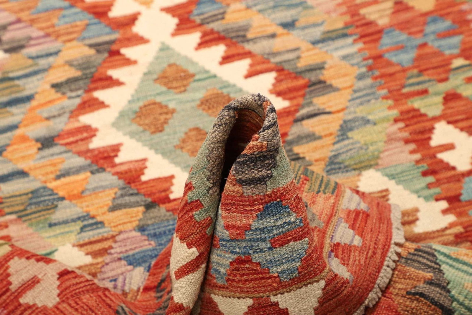 Hergestellt aus reiner Schurwolle, bietet dieser Kelim Teppich nicht nur eine hervorragende Optik, sondern auch ein angenehmes Laufgefühl. Schurwolle hat den Vorteil, dass sie temperaturregulierend wirkt und hervorragende Eigenschaften in Bezug auf Feuchtigkeit und Schmutz bietet. Zudem ist der Teppich, dank der Handwebtechnik, besonders robust und langlebig. Diese traditionelle Methode garantiert, dass jeder Teppich ein Unikat ist, wobei die Detailverliebtheit und die Kunstfertigkeit des Handwerks in jedem Muster und jeder Farbkombination zum Ausdruck kommt.
