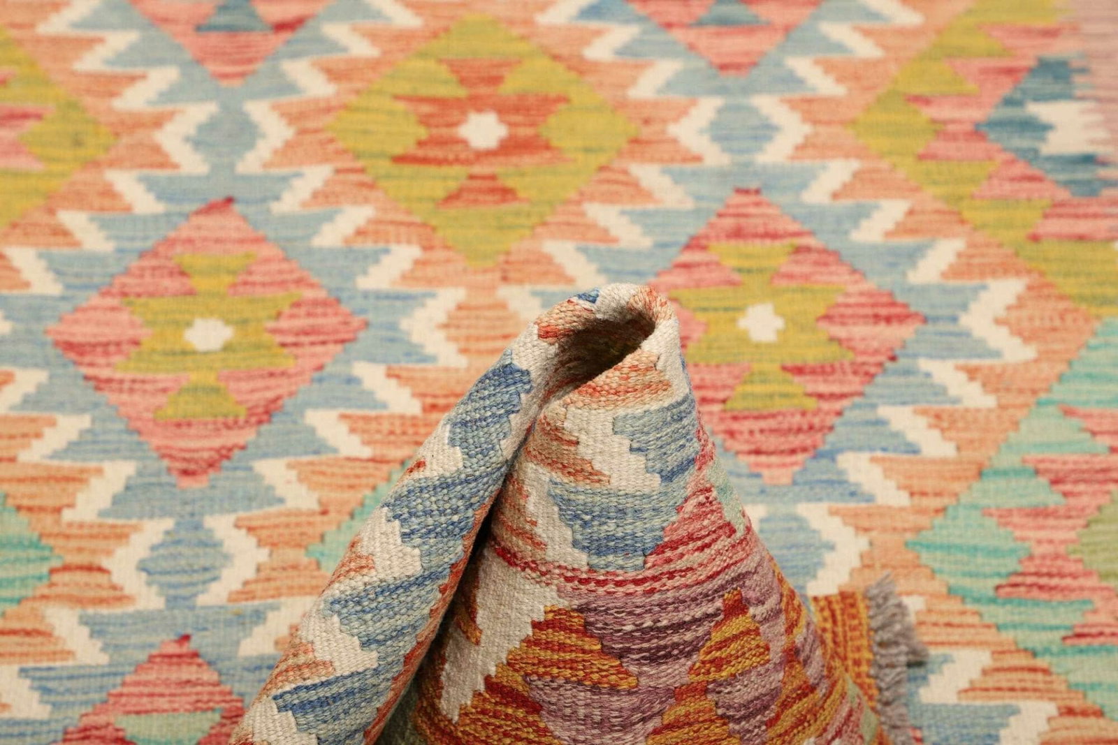 Das Design dieses handgewebten Kelim Teppichs ist rustikal und verleiht jedem Raum eine gemütliche Atmosphäre. Die Farbpalette reicht von Erdtönen bis hin zu kräftigen Akzenten, die harmonisch miteinander kombiniert sind. Geometrische Formen und traditionelle Symbole sind charakteristisch für den Kelim-Stil und machen diesen Teppich zu einem Blickfang in jedem Raum.