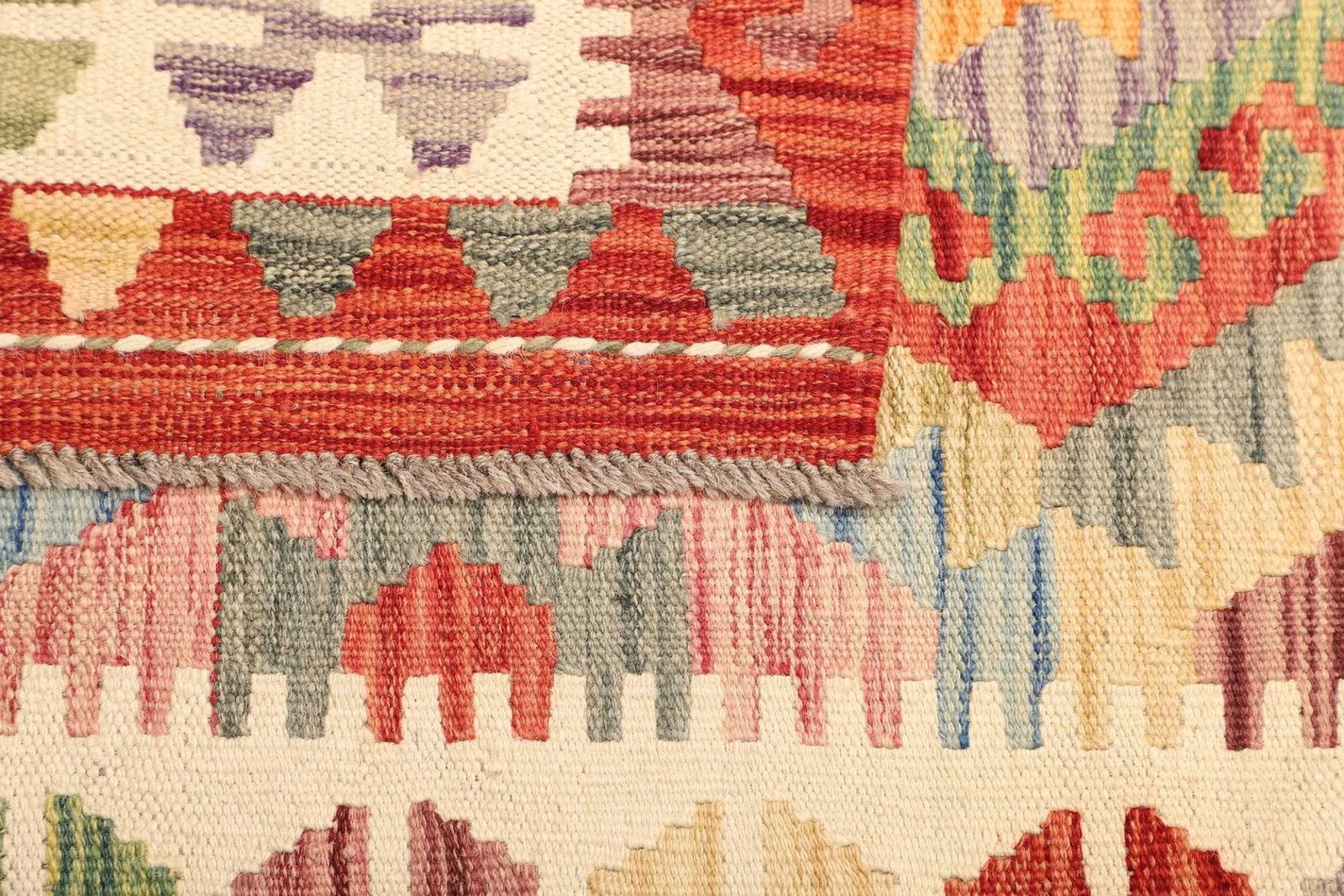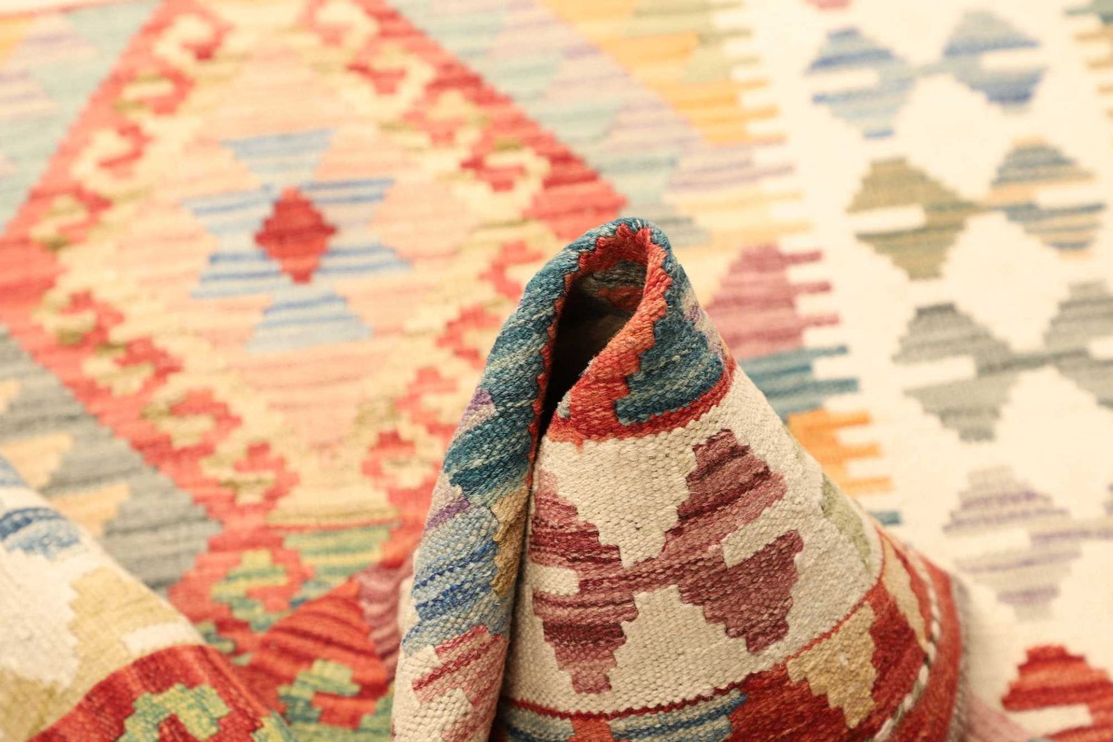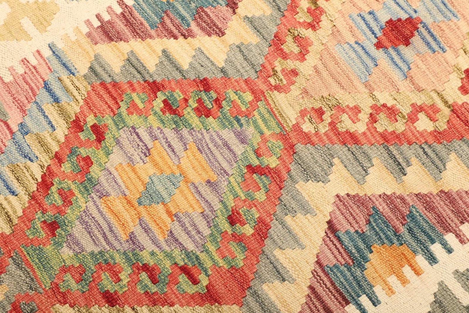 Ein weiteres herausragendes Merkmal dieses Kelim Teppichs ist seine Pflegeleichtigkeit. Schurwolle ist bekannt dafür, dass sie Staub und Schmutz abweist, wodurch der Teppich weniger häufig gereinigt werden muss. Seltene und exklusive Stücke aus handgewebter Wolle bieten nicht nur Komfort, sondern auch einen einzigartigen Charakter und stilistische Akzente in Ihrem Wohnraum. Jede Ecke des Teppichs erzählt eine Geschichte, die durch die Hände der Weber zum Leben erweckt wurde und somit einen unverwechselbaren Charakter erhält.