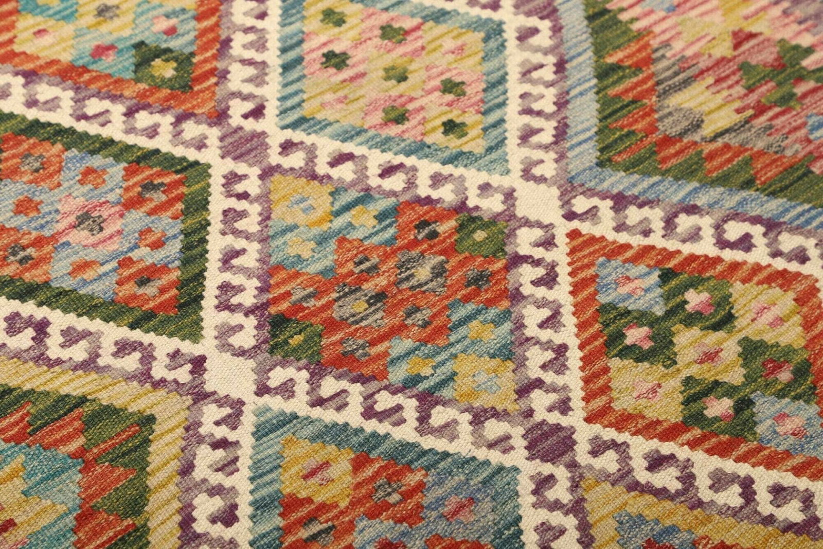 Der rustikale Look dieses Kelim Teppichs zeichnet sich durch eine harmonische Kombination aus traditionellen Mustern und zeitgenössischem Design aus. Die lebendigen Farben und das geometrische Spiel verleihen ihm eine besondere Aura und machen ihn zu einem echten Blickfang in jedem Raum. Die unterschiedlichen Muster sind nicht nur ästhetisch ansprechend, sondern können auch symbolische Bedeutungen transportieren. Rot steht oft für Kraft, Blau für Harmonie und Grün für Fruchtbarkeit. Die Kombination dieser Farben in einem Teppich bringt ein Gefühl von Ausgewogenheit und Ästhetik in Ihr Zuhause.