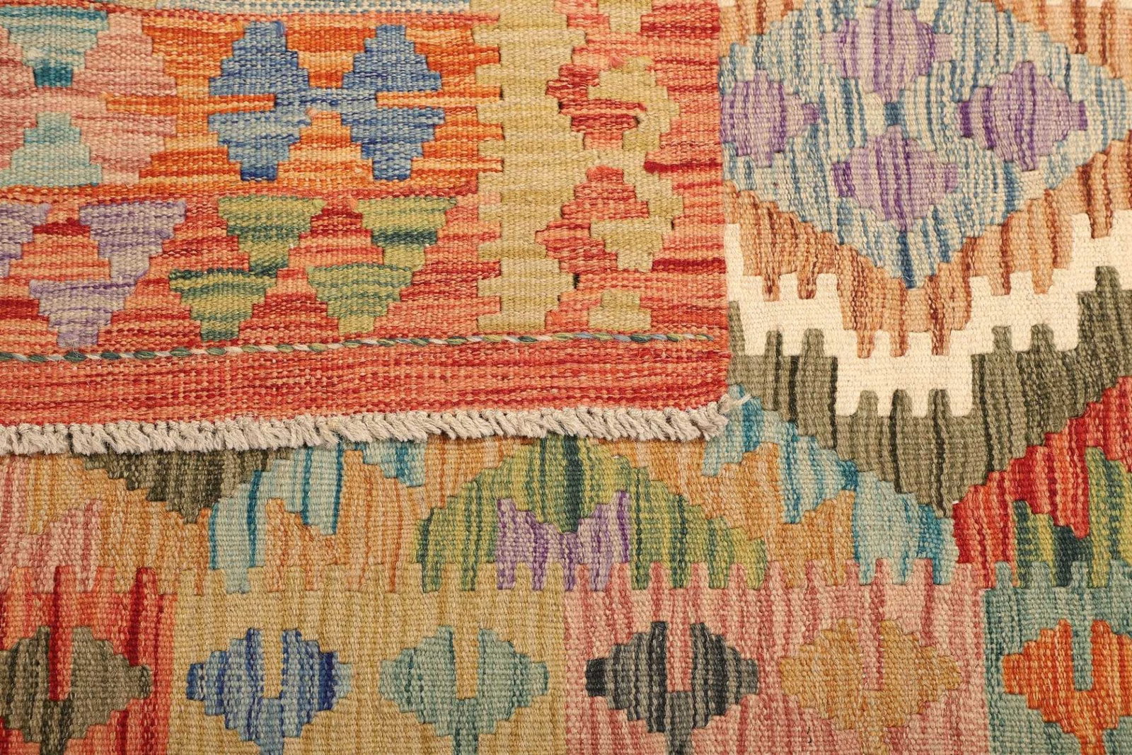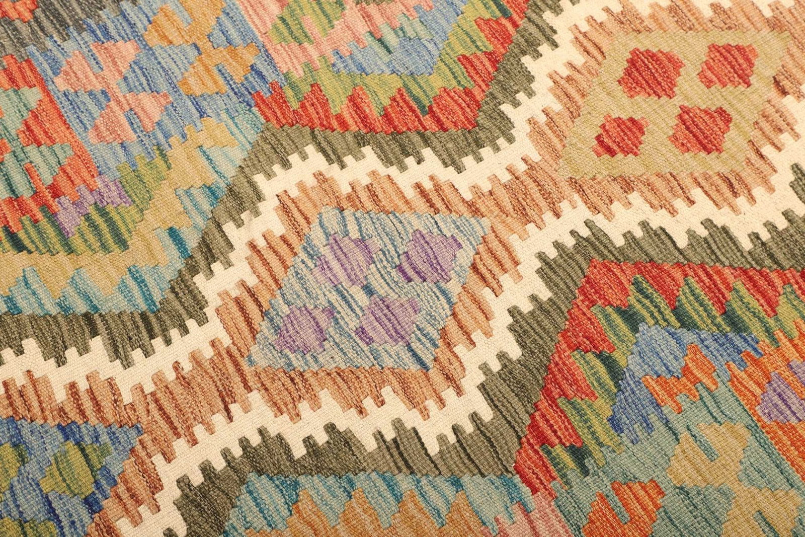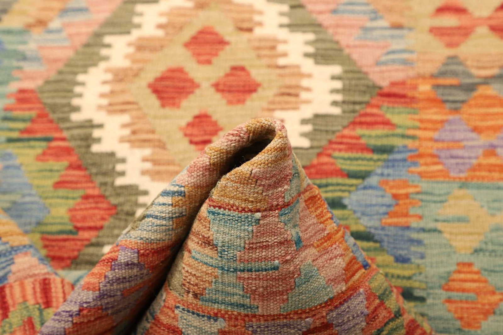Der Kelim Teppich besteht aus reiner Schurwolle, die für ihre Langlebigkeit und Pflegeleichtigkeit bekannt ist. Wolle bietet zudem eine hervorragende Isolierung und trägt zur Verbesserung des Raumklimas bei. Die handgewebte Technik sorgt dafür, dass jeder Teppich ein Unikat ist, das mit viel Liebe und Fertigungskunst hergestellt wurde. Die Knotendichte ist optimiert, um eine perfekte Balance zwischen Weichheit und Strapazierfähigkeit zu erreichen. Dieser Teppich eignet sich somit perfekt für stark frequentierte Bereiche in Ihrem Zuhause, wie Wohnzimmer oder Flure.