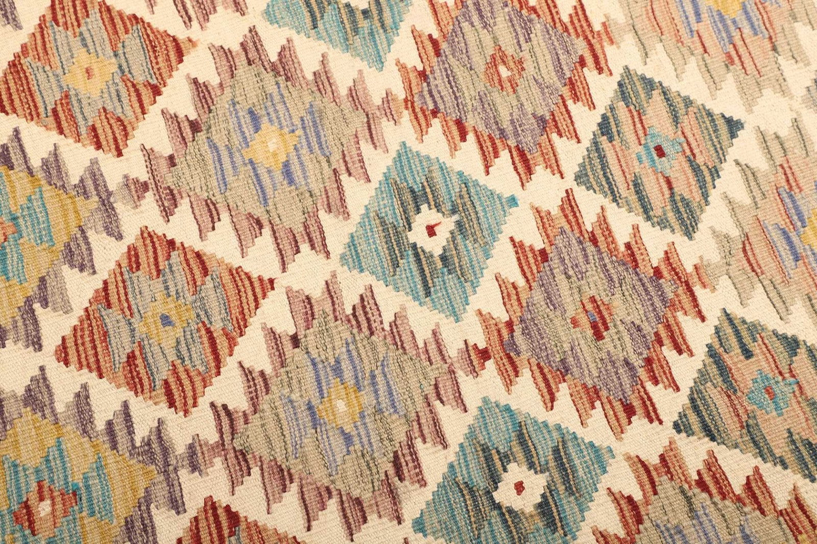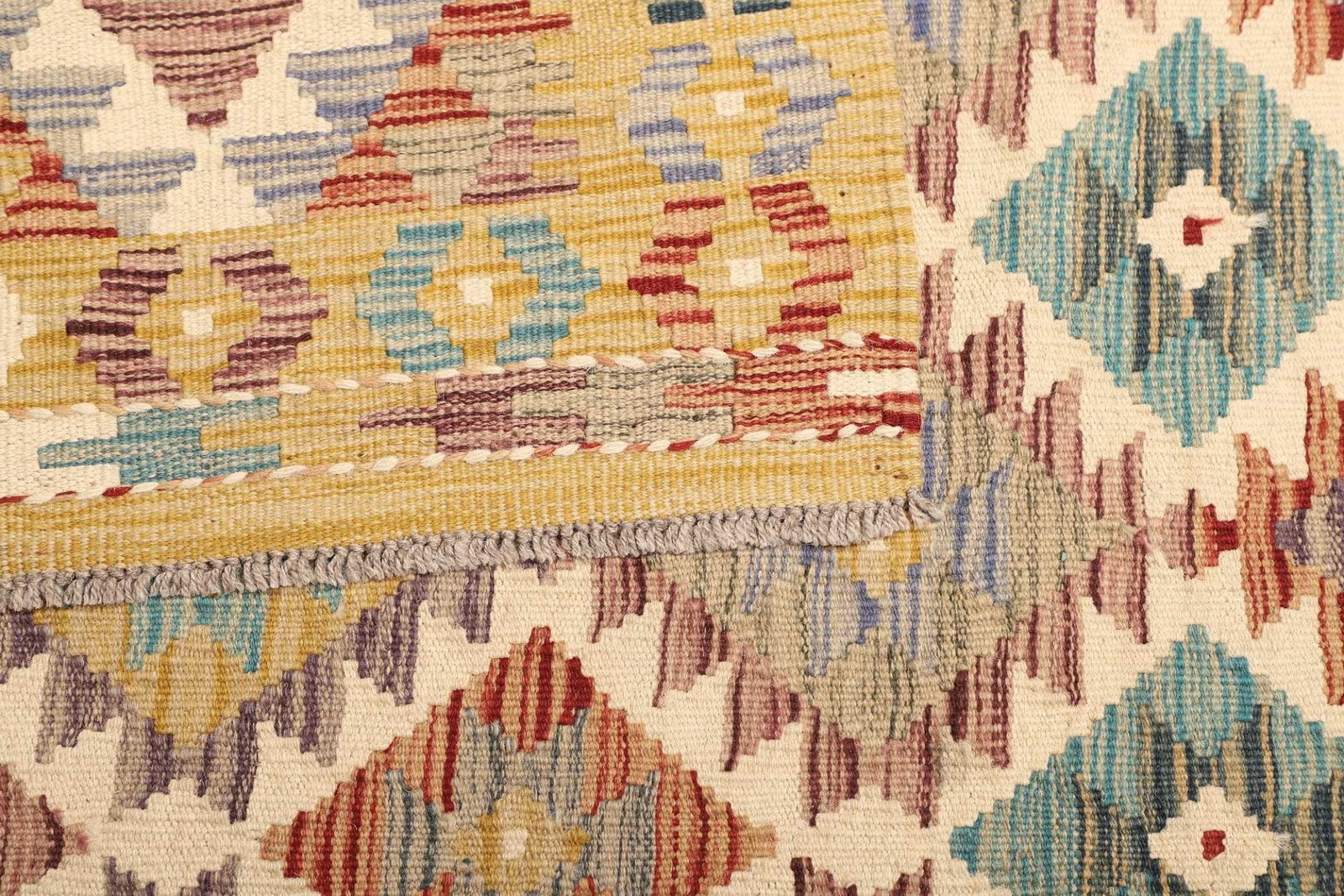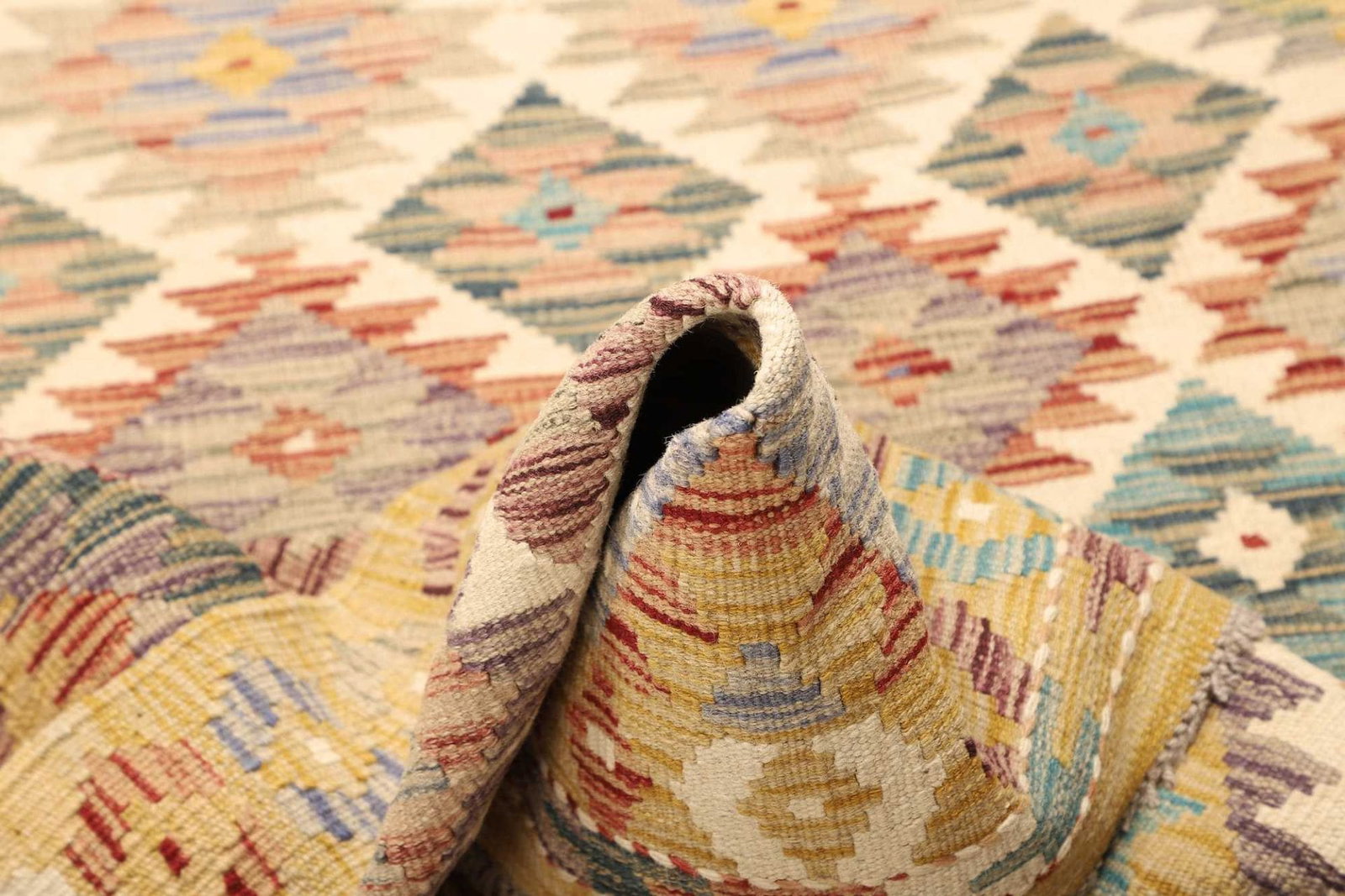 Das handgewebte Material garantiert eine hohe Knotendichte, die für Langlebigkeit und Robustheit sorgt. Die spezielle Webtechnik, die für Kelim Teppiche charakteristisch ist, verleiht dem Teppich eine einzigartige, flache Oberflächenstruktur, die perfekt zu verschiedenen Einrichtungsstilen passt. Ob in einem modernen Loft, einem klassischen Wohnzimmer oder in einem rustikalen Landhaus – dieser Teppich fügt sich harmonisch in jede Umgebung ein und wird schnell zum Blickfang.