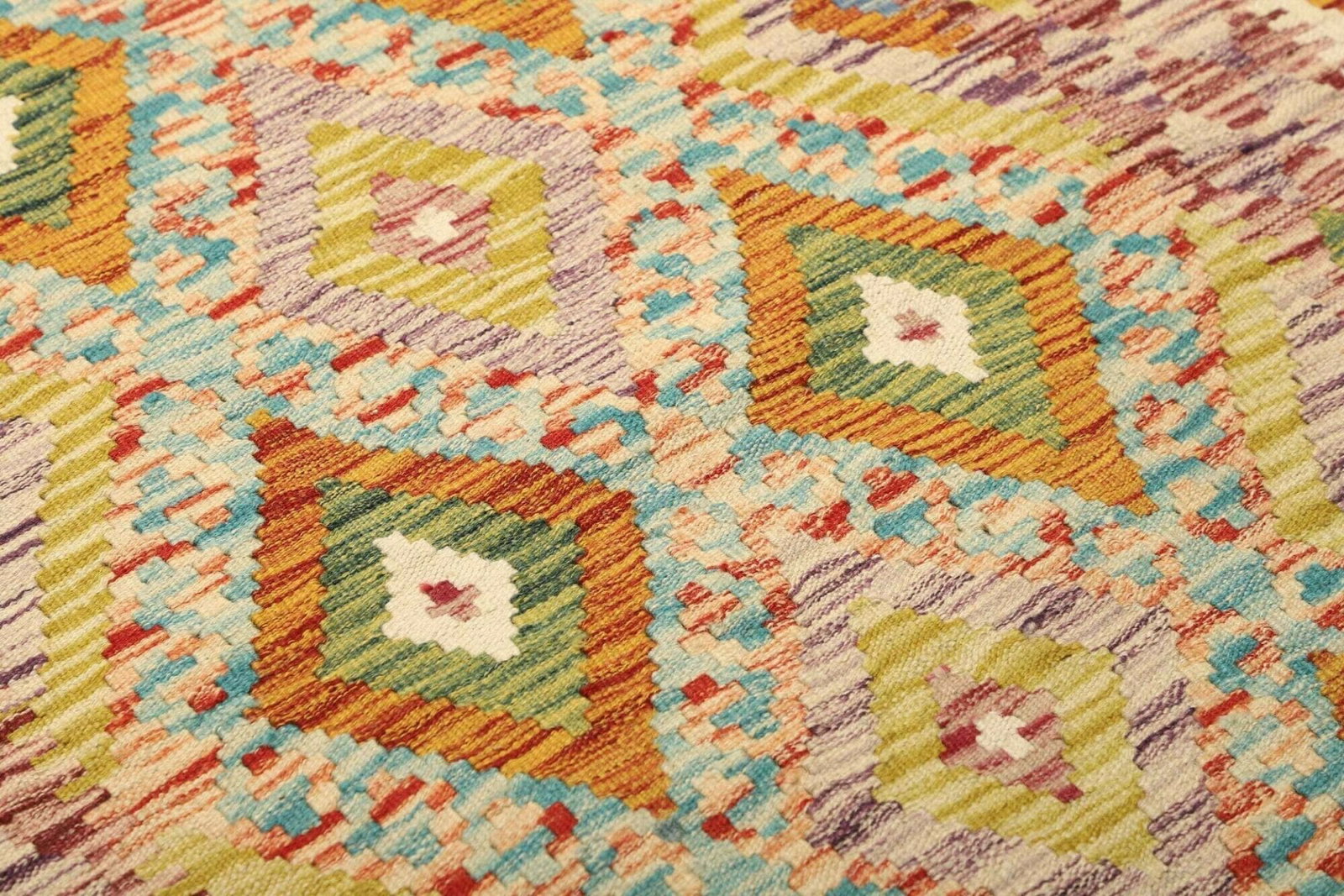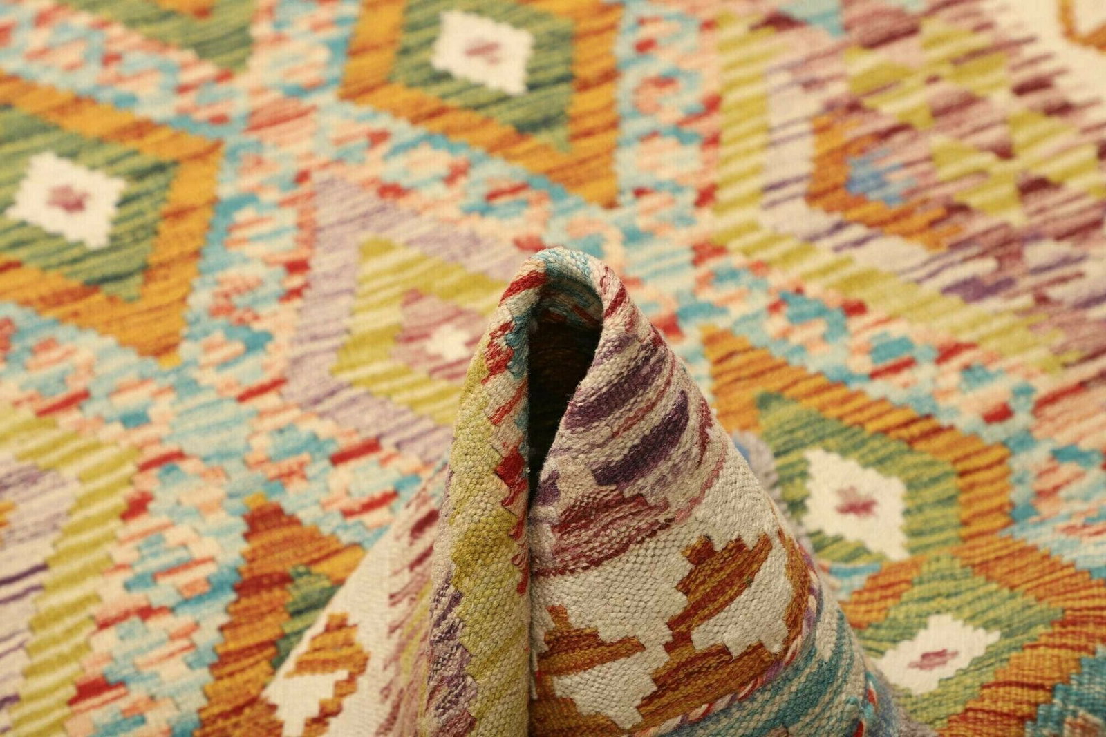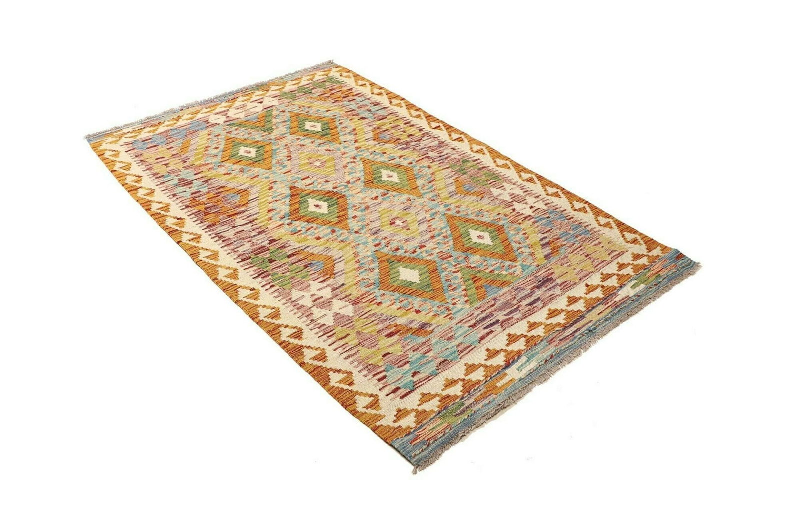 Der Kelim Teppich ist aus hochwertiger Wolle gefertigt, die für ihre Langlebigkeit und natürlichen Eigenschaften bekannt ist. Wolle ist nicht nur besonders weich und angenehm unter den Füßen, sondern sorgt auch für einen angenehmen Raumklima, da sie Feuchtigkeit reguliert. Durch die besondere Handwebtechnik entsteht ein flacher, strapazierfähiger Teppich, der sich perfekt für vielfältige Einrichtungsstile eignet. Die Knotendichte ist optimal gewählt, um einerseits die Flexibilität und andererseits die Robustheit des Teppichs zu gewährleisten.