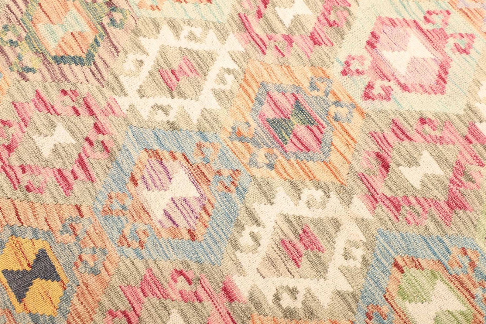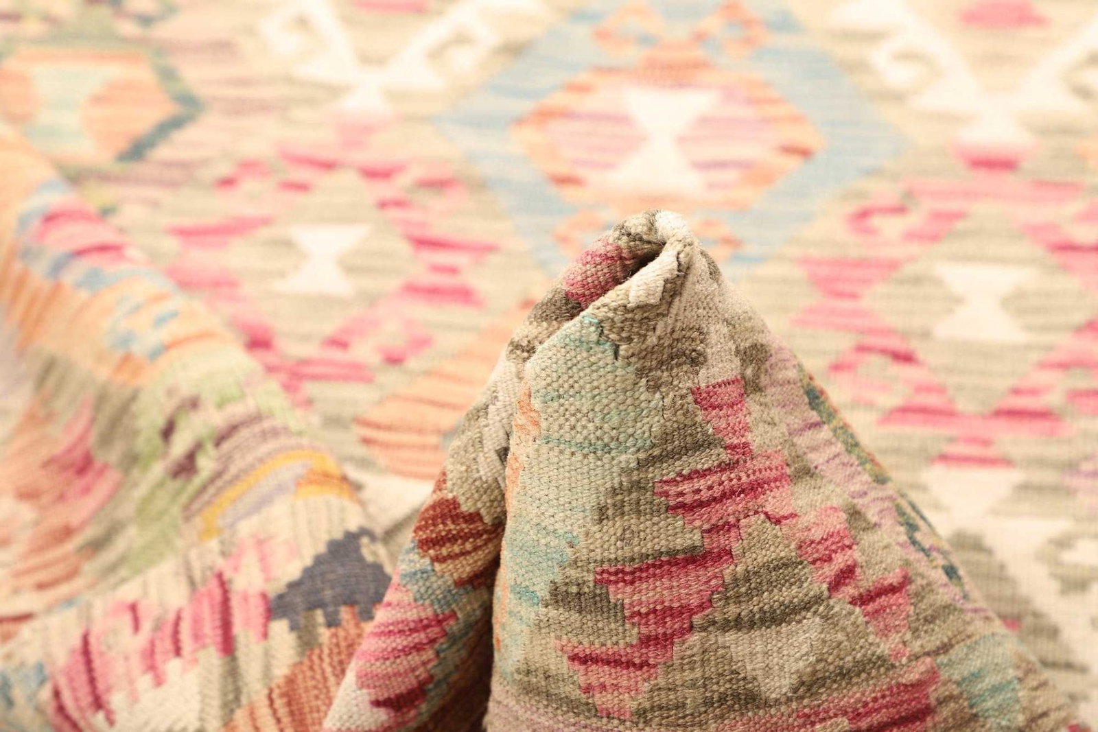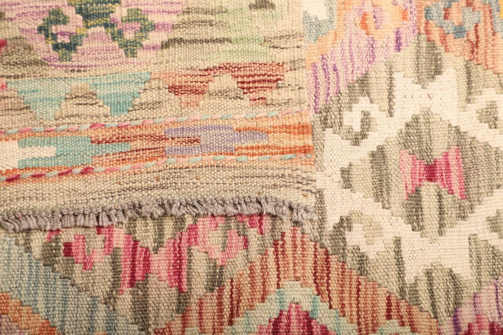 Der Teppich zeichnet sich nicht nur durch seine erstklassigen Materialien aus, sondern auch durch seine ansprechenden Designs und Muster. In traditioneller Kelimteppich-Technik gewebt, bietet er eine Vielzahl von geometrischen Mustern und lebendigen Farben, die in jedem Interieur zur Geltung kommen.