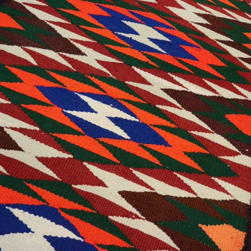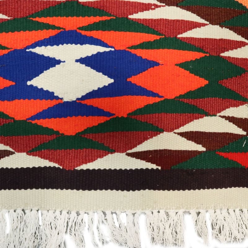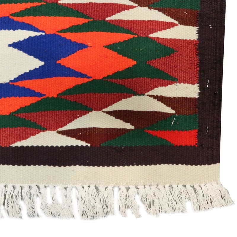 Der Kelim Teppich wird aus reiner Schurwolle gewebt, einem Material, das für seine Strapazierfähigkeit und Langlebigkeit bekannt ist. Die Wolle sorgt zudem für eine angenehme Haptik und einen natürlichen Look. Jedes Stück wird in sorgfältiger Handarbeit gefertigt, was bedeutet, dass die Liebe und Sorgfalt, die in jeden Teppich einfließen, sichtbar sind. Die handgewebte Technik erlaubt feinere Muster und eine höhere Knotendichte, was den Teppich nicht nur ästhetisch ansprechend, sondern auch besonders robust macht.