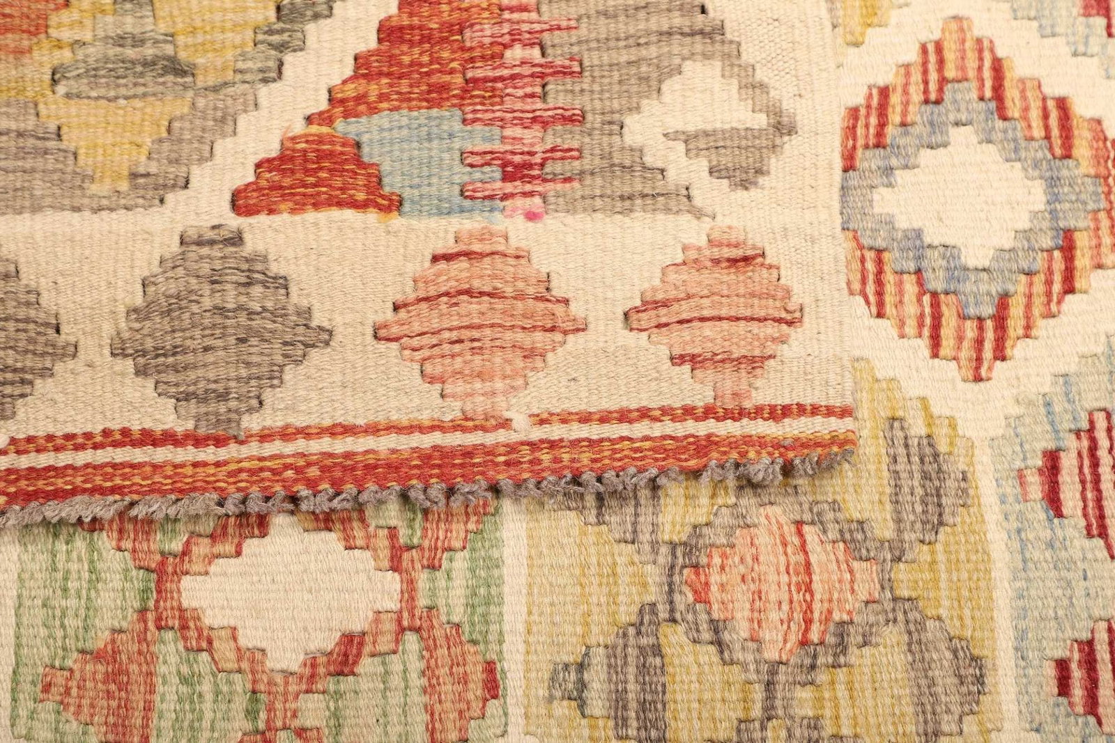 Ein besonders hervorzuhebendes Merkmal dieses handgewebten Kelim Teppichs ist seine Vielseitigkeit. Er kann sowohl in Wohnräumen als auch in Fluren oder Schlafzimmern genutzt werden. Zudem lässt er sich problemlos mit verschiedenen Einrichtungsstilen kombinieren, egal ob bohemian, minimalistisch oder rustikal.